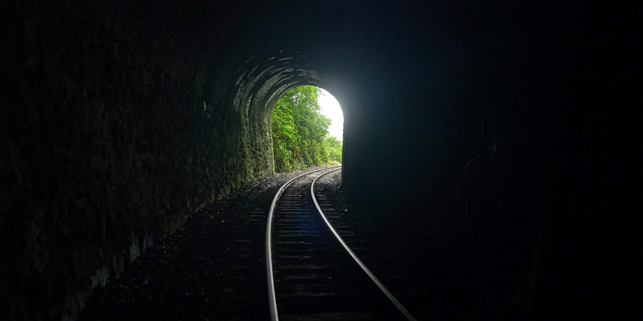 Chegamos no começo da trilha no Mirante "Para o Rio Natal, dali demos início ao FerroTrekking que deu um total de mais ou menos 21 Km, sendo que no primeiro dia fizemos 13 Km e no segundo, uns 8 Km aproximadamente. Passamos por 5 pontes e 5 túneis sendo o último o mais extenso e mais legal também. Por não se ver o fim dele no começo tivermos que ligar as lanternas pra atravessar com segurança.