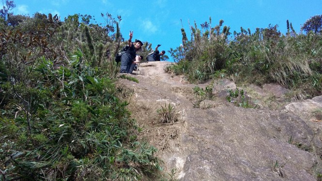 Achei graça ao perceber que os montanhistas que estavam no cume olhavam com estranheza aqueles dois velhinhos que chegaram somente com a roupa do corpo, deve mesmo ter sido surreal. A trilha de volta do cume até o A2, onde estavam nossos amigos, é relativamente fácil, só descida, que dá para percorrer em menos de uma hora, e somente hoje me dou conta que subimos sem o mais básico dos equipamentos, a lanterna, mas parecia que se levássemos a mochila não conseguríamos chegar ao pico...