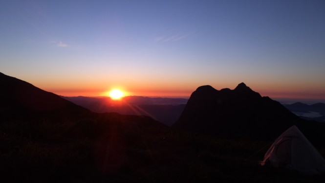Nossas barracas ao nascer do sol, com o Pico Paraná ao fundo. Em primeiro plano nosso saco de lixo, devidamente amarrado na barraca para não voar.