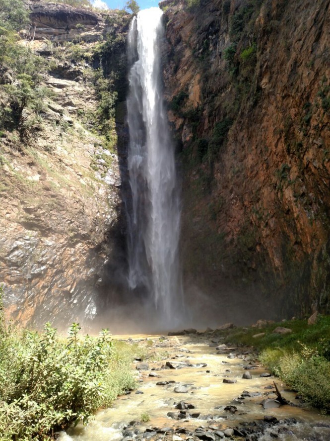 1º Dia: Cachoeira da Jiboia. Saímos de Unaí em direção a Uruana de Minas, após pegar informações com o Shinna, ciclista que possui uma loja no centro de Unaí e conhece vários locais na região. Após passar no distrito de Guarapuava, andamos mais 17 KM e entramos à direita em um local com a placa informando que ali era a entrada da Jibóia, após uma boa descida no asfalto. O terreno da cachoeira já fica no município de Uruana de Minas. Então percorremos mais 5km de carro em uma estrada boa, mas que me pregou uma peça em um riacho que pensei ser transponível. Acabei danificando a frente nas pedras, com direito a estragar o ar condicionado. Tive que deixar o carro ali mesmo, agradecendo pelos danos não serem maiores. Apesar dos relatos dizerem que dá para chegar mais à frente de carro normal, só recomendo para 4 X 4. Do riacho (pessoal da região chama de grota) até a cachoeira são aproxidamente 1km de caminhada. Há um quiosque abandonado, o que leva a supor que o dono da fazenda tentou fazer um empreendimento que não vingou. A queda é espetacular, com belos paredões nos lados. São 144 metros de queda livre que forma uma lago enorme. A água estava turva pela chuva e a correnteza impedia de entrar. Apesar de ser um sábado em um feriadão, não havia ninguém. O plano incluía subir até o topo da cachoeira, marcando no wikiloc, por meio de uma trilha/caminho de gado que o Shinna nos informou. Ele nos disse que o caminho estaria tomado por mato e que seria muito perigoso fazer por conta própria, já se trata de uma trilha subindo por um morro com despenhadeiros dos dois lados. Até tentamos, mas realmente estava muito perigoso sem nenhum equipamento de orientação. Já que o capim passava de 2 metros de altura, achamos mais prudente desistir. Ficou o desejo de voltar e fazer aquela trilha ao topo com os conhecimentos e equipamentos necessários. Ainda tínhamos o objetivo de conhecer a Cachoeira Pilão de Pedra naquele dia, mas achamos melhor voltar para Unaí e buscar um mecânico que pudesse olhar o carro.