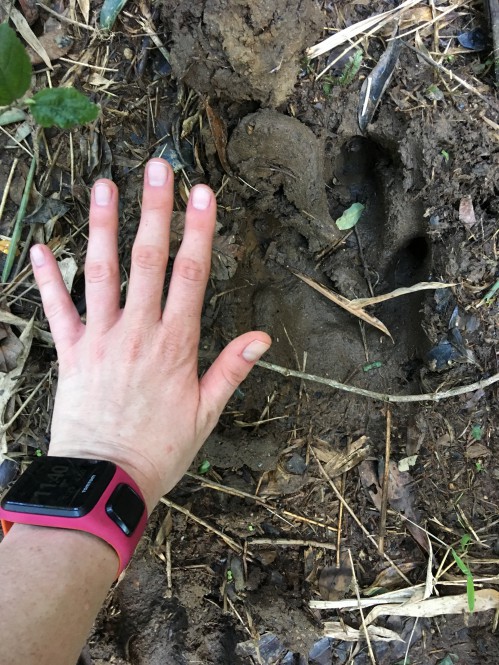Conseguimos encontrar o caminho com tranquilidade e sem perdidos dessa vez. Percorremos o caminh até a picada muito mais rápido que da outra vez, mesmo cuidando bastante para andar por conta das cobras. Nosso primeiro susto foi com os carrapatos que peguei atravessando uma propriedade particupar, onde haviam cavalos. Estava lotada de aracníceos caminhando pelas minhas pernas, braços e até barriga. Tive que parar e retirar todos que consegui, pois a sensação de ter aqueles bichinhos caminhando na pele é perturbadora. No caminho para a entrada das montanhas um novo susto: pegadas enormes de algum bicho com quatro patas. Depois, pesquisando em casa, descobri que as mesmas eram de Anta! Ver aquelas pegadas na trilha, super frescas, com o tamanho da minha mão e afundadas uns 5cm na lama foi assustador. Quase desistimos da trilha por conta disso, ficamos com muito medo de encontrar um animal tão grande em um local remoto daqueles.