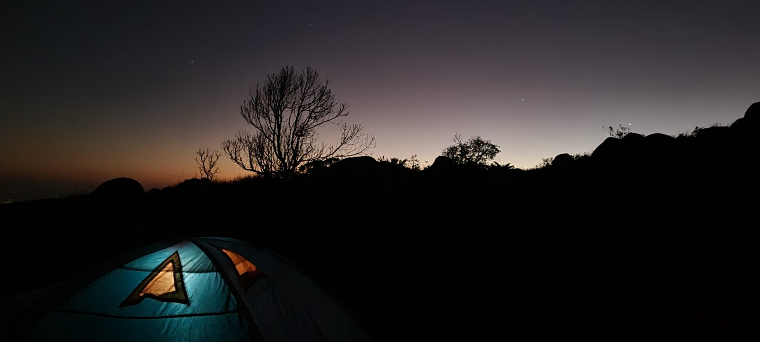 A noite, preparamos o jantar e dormimos cedo. Na madrugada, fomos acordados com rajadas de vento que nos obrigou a reforçar as amarras da barraca com pedras.