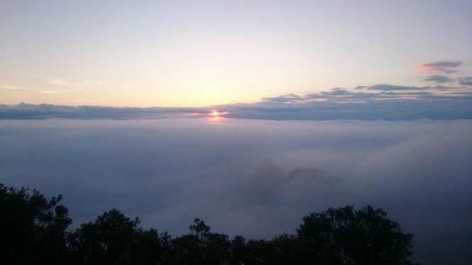 Ao nascer do sol conseguimos um pouco de visão mas não por muito tempo. A medida que a temperatura subia as nuvens subiram tambem, fazendo tomarmos mais um pouco de garoa durante o café da manhã, mas logo parou de garoar e pudemos arrumar as coisas e descer tranquilamente.
