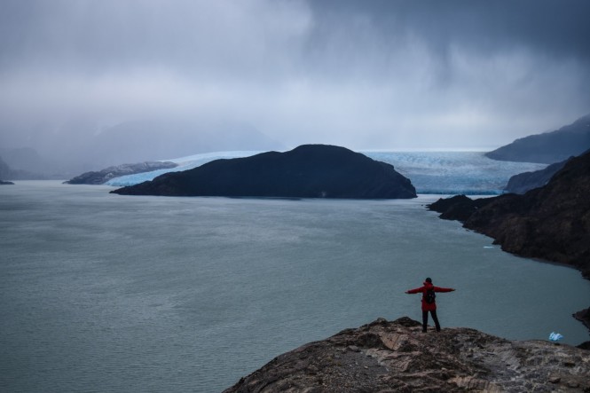 Depois de quase 3 horas de caminhada e muito vento no caminho, chegamos ao Mirador Grey. O tempo estava bem fechado. A geleira Grey se misturava com o céu e não dava para saber onde terminava a geleira e começava o céu. A geleira é um local impressionante!
