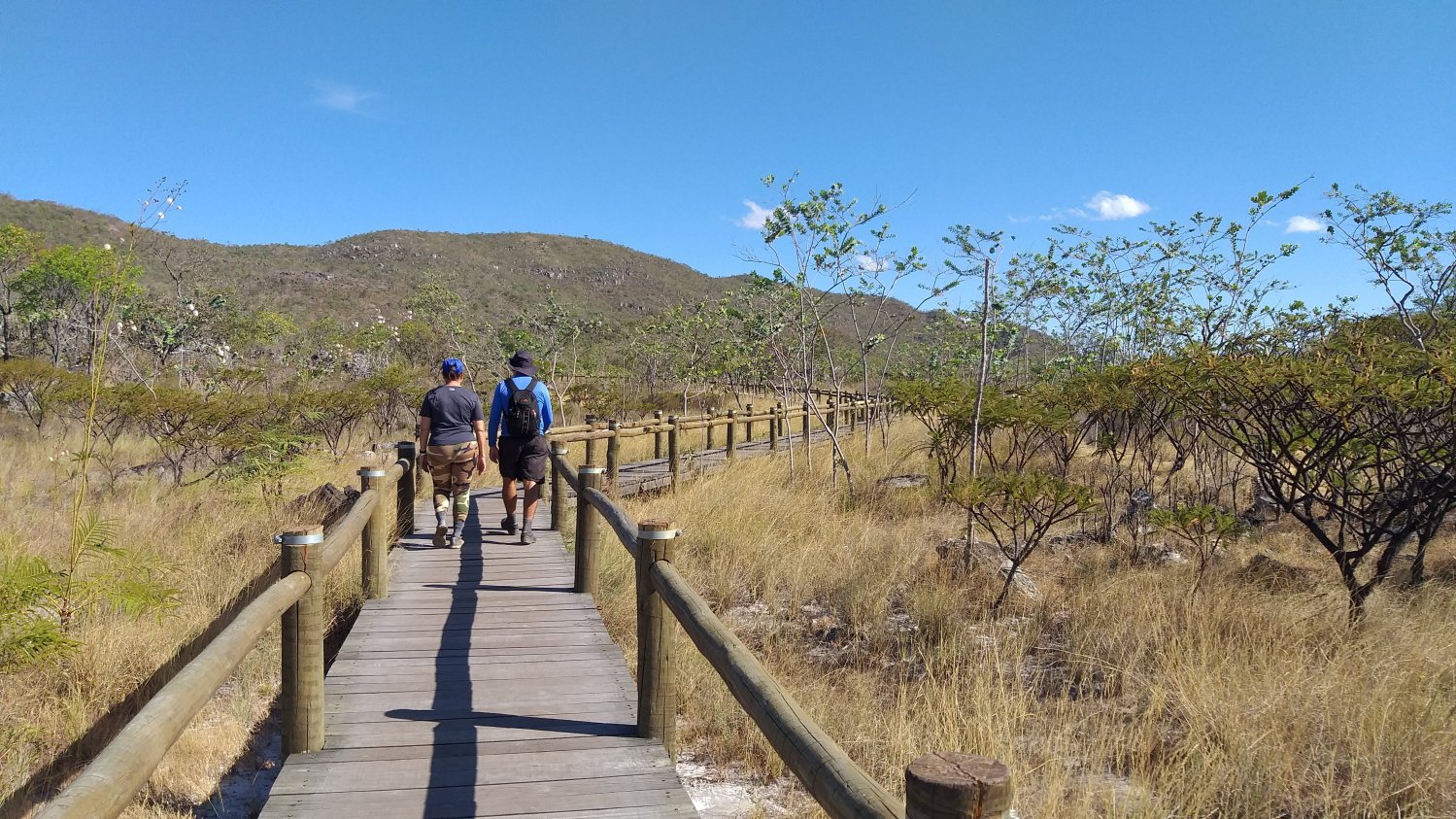 Neste dia, era trilha dentro do Parque Nacional da Chapada dos Veadeiros. Acordamos, tomamos nosso café, preparamos nossa mochila e partimos andando para o Parque Nacional. O camping onde fiquei é muito próximo da entrada do parque, então fomos andando. Assim, economizamos gasolina (não há postos de gasolina na Vila de São Jorge) e também não precisaríamos pagar o estacionamento (que tem o custo de R$ 15).