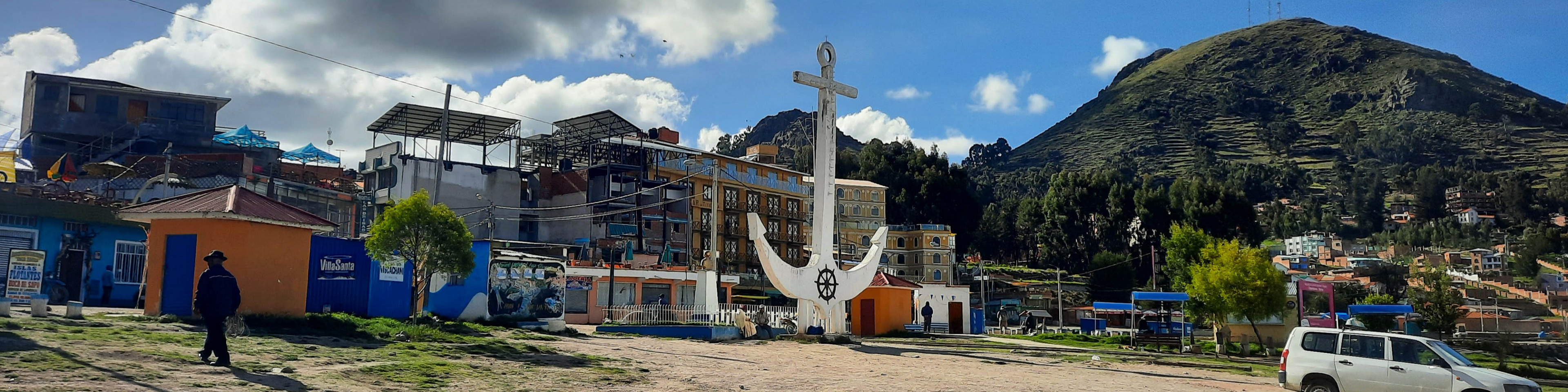 Depois de algumas horas de estrada, em uma estrada absurdamente linda, cheguei em Copacabana. Muito bonitinho o centrinho da cidade. Embora a praça central estivesse em reformas, deu a igreja e as lojas. Cidade muito bem organizada e limpa.
