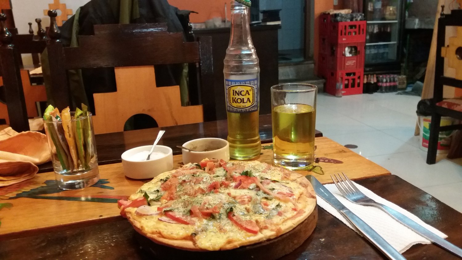 Andei mais um pouco por Machu picchu Pueblo e então fui comer uma pizza. Sabor da pizza: Machu Picchu, haha. Pedi uma dessa e uma Inca Cola.