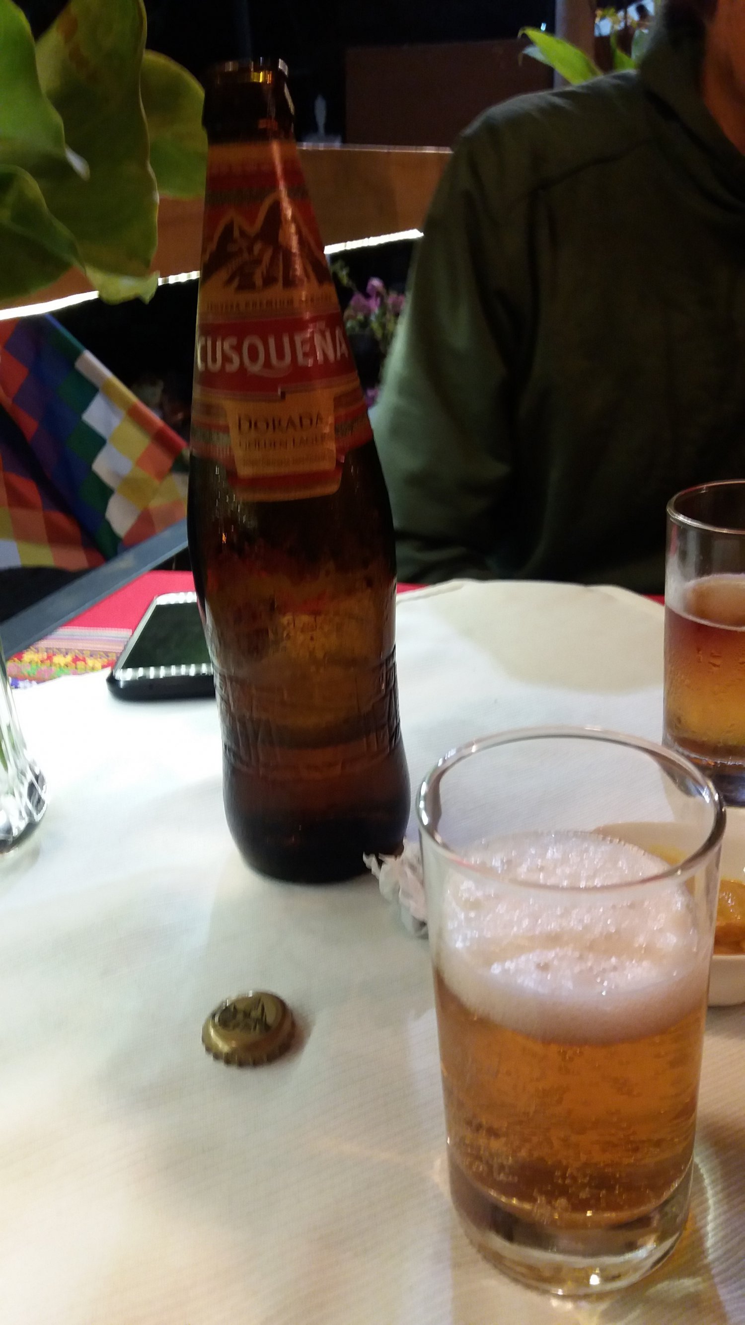 Depois de pagar a pizza e conversar pelo wifi, fui ao encontro do Leonardo. Depois de andar, andar e andar... finalmente achei o tal restaurante que ele estava. Finalmente, tomei uma cerveja local do Peru. Ele que me recomendou. Gostei.