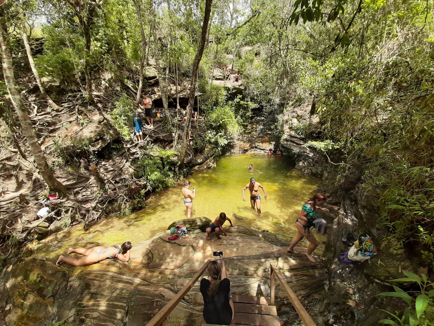 Dali fomos para a cachoeira véu da noiva. Sem custos. Ao chegar perto dela, já dava para ver uma fila de carros e ônibus estacionados. Descemos até a cachoeira e estava lotada. Como chegamos nela por volta de meio dia, estava lotada mas muita gente indo embora. Para almoçar, talvez.