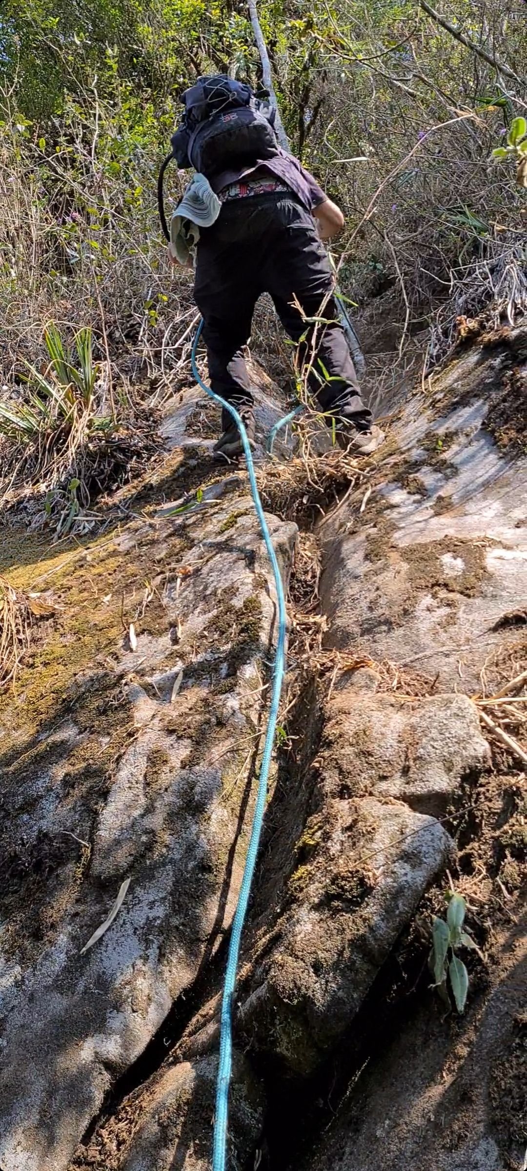Após descer o vale e ganhar um desnível leve, chega a parte mais técnica da trilha. Uma escalaminhada de uns 12 metros. Levamos uma corda para nossa própria segurança.