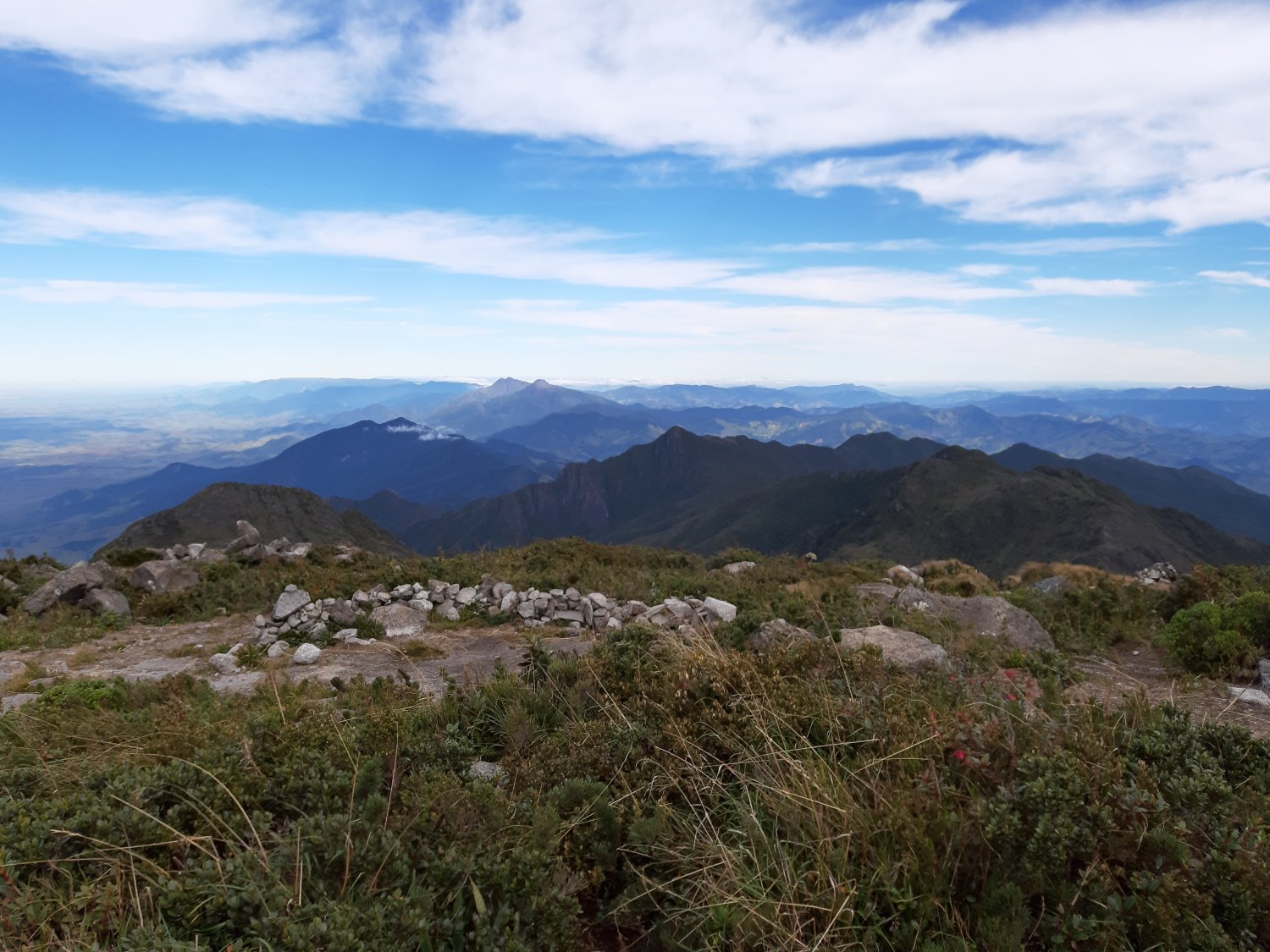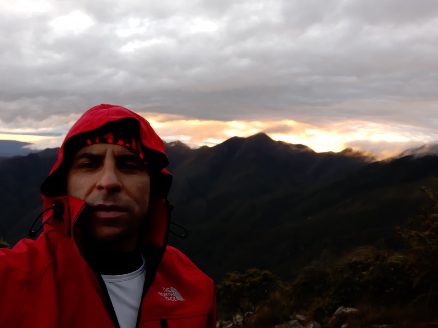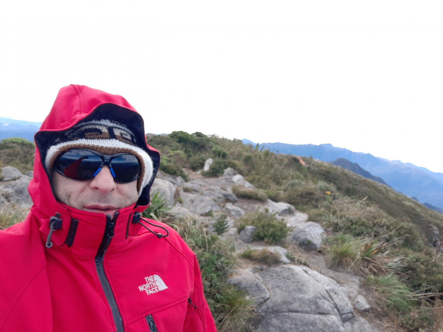 O tempo ainda estava fechado, mas a previsão era de Sol a pino. Uma ventania foi prevista para esse dia, limpando a atmosfera e reduzindo para muitos graus abaixo de zero a sensaçao térmica. No mesmo dia, na estação meteorológica do Pico do Couto (Itatiaia), foram registrados ventos de 60km/h e rajadas que chegaram a 90km/h e a temperatura minima foi de +2°. Acredito que no topo da Pedra da Mina, na qual eu cheguei as 9h50, os ventos estavam por ai (80km/h). Era dificil de ficar em pé. Quando acessamos a crista ao lado da "cratera", o vento era tão forte que me jogava totalmente para o lado esquerdo (Vale do Ruah). Consegui ficar 5 min no topo, assinei o livro com os dedos duros, e comecei a descer. Estava lindo la em cima, porém, no Brasil foi a minha experiência mais fria de todas, sem duvida!