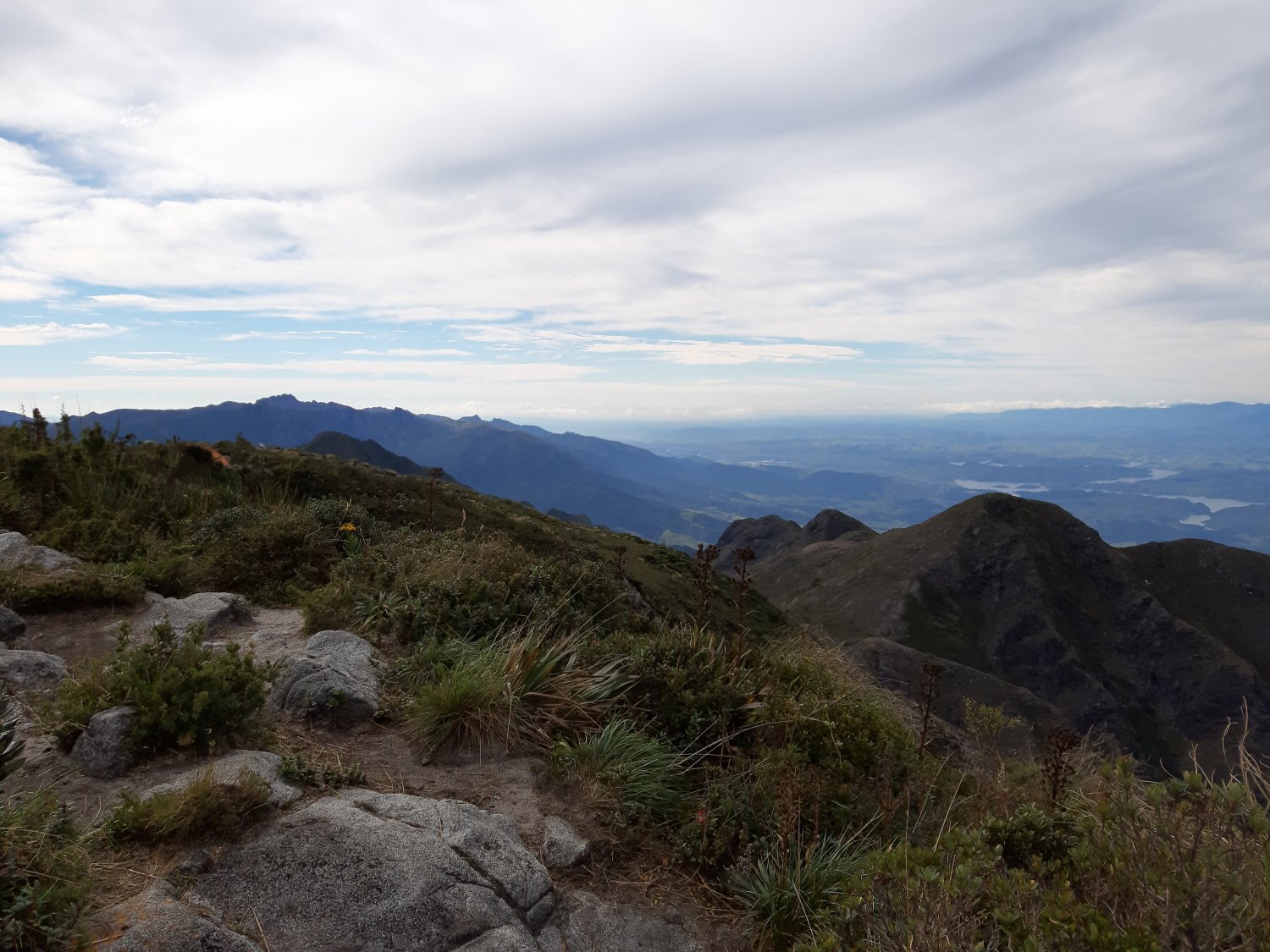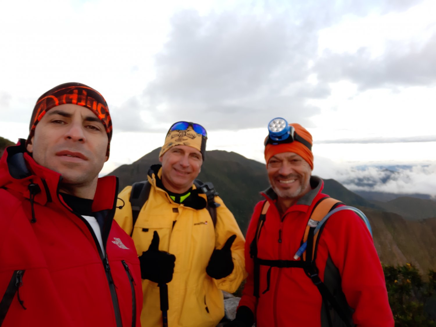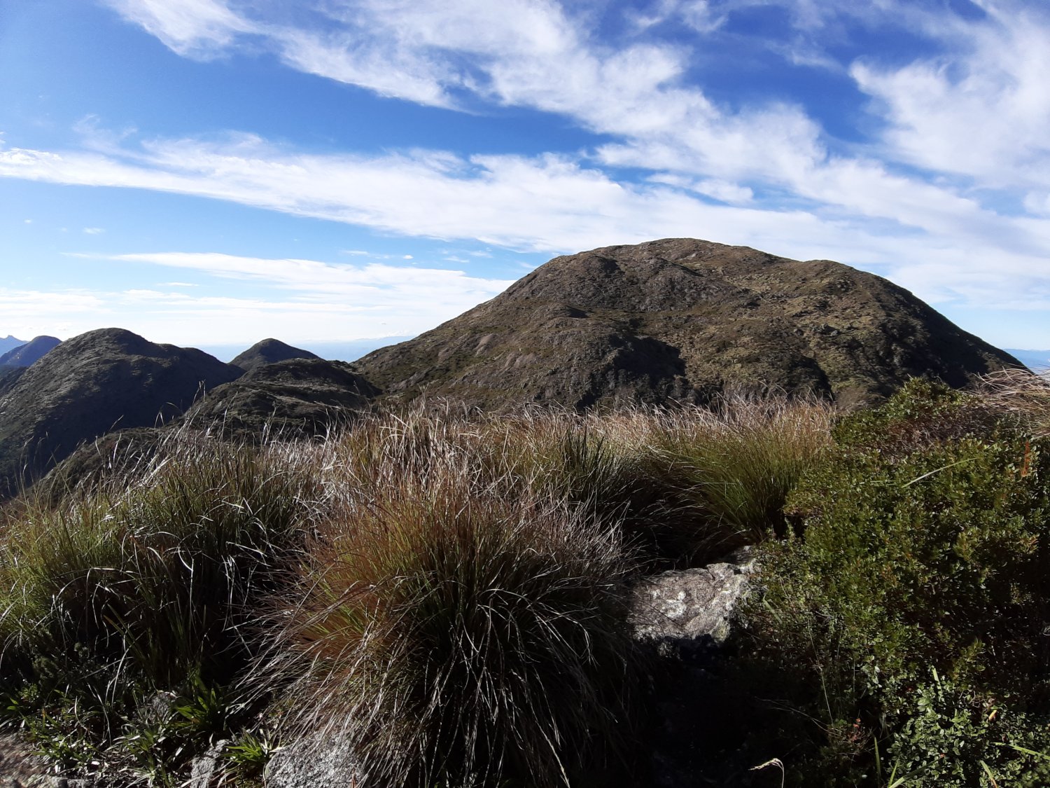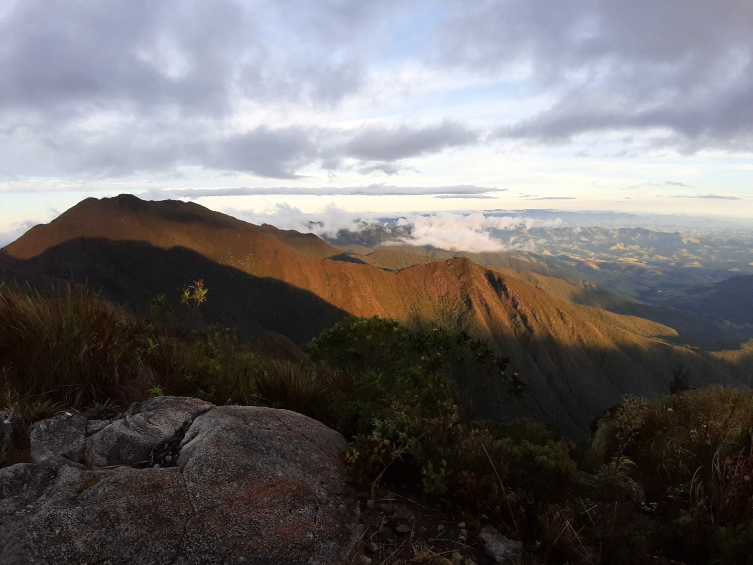 O tempo ainda estava fechado, mas a previsão era de Sol a pino. Uma ventania foi prevista para esse dia, limpando a atmosfera e reduzindo para muitos graus abaixo de zero a sensaçao térmica. No mesmo dia, na estação meteorológica do Pico do Couto (Itatiaia), foram registrados ventos de 60km/h e rajadas que chegaram a 90km/h e a temperatura minima foi de +2°. Acredito que no topo da Pedra da Mina, na qual eu cheguei as 9h50, os ventos estavam por ai (80km/h). Era dificil de ficar em pé. Quando acessamos a crista ao lado da "cratera", o vento era tão forte que me jogava totalmente para o lado esquerdo (Vale do Ruah). Consegui ficar 5 min no topo, assinei o livro com os dedos duros, e comecei a descer. Estava lindo la em cima, porém, no Brasil foi a minha experiência mais fria de todas, sem duvida!