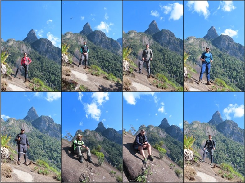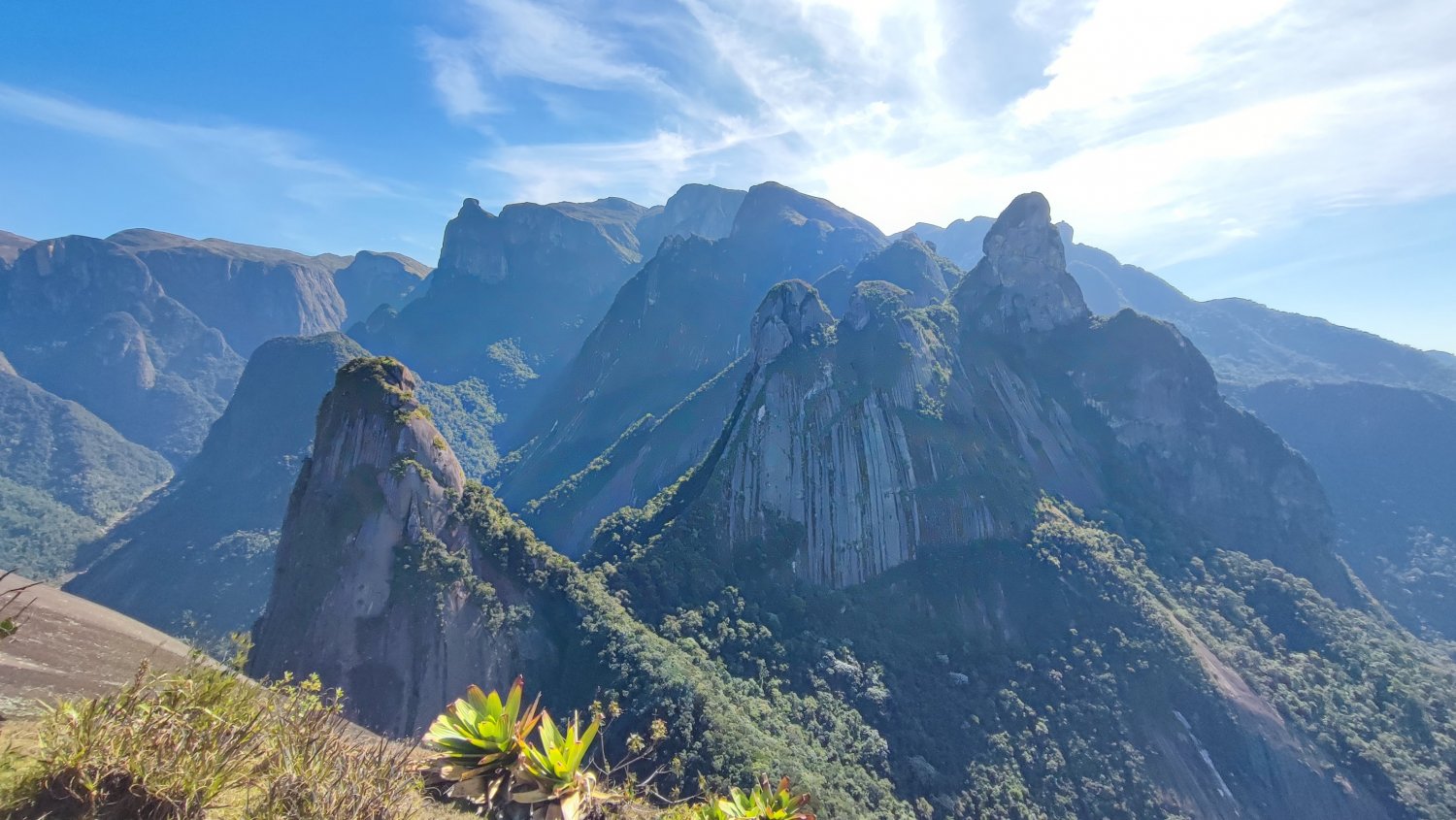 Retornamos à caminhada e logo chegamos ao primeiro trecho na crista da montanha, em que a paisagem abriu para as primeiras fotos panorâmicas do dia, com a visão da estrada e do Dedo de Deus e seu entorno. O vento foi o principal fator de preocupação naquele momento, pois estava razoavelmente forte e possivelmente estaria mais forte nos trechos expostos acima. Caio levava seu drone e uma câmera fotográfica 360° e era o responsável pela documentação visual do grupo. Mas ele mesmo chegou a duvidar se seria possível realizar o voo naquelas condições.
