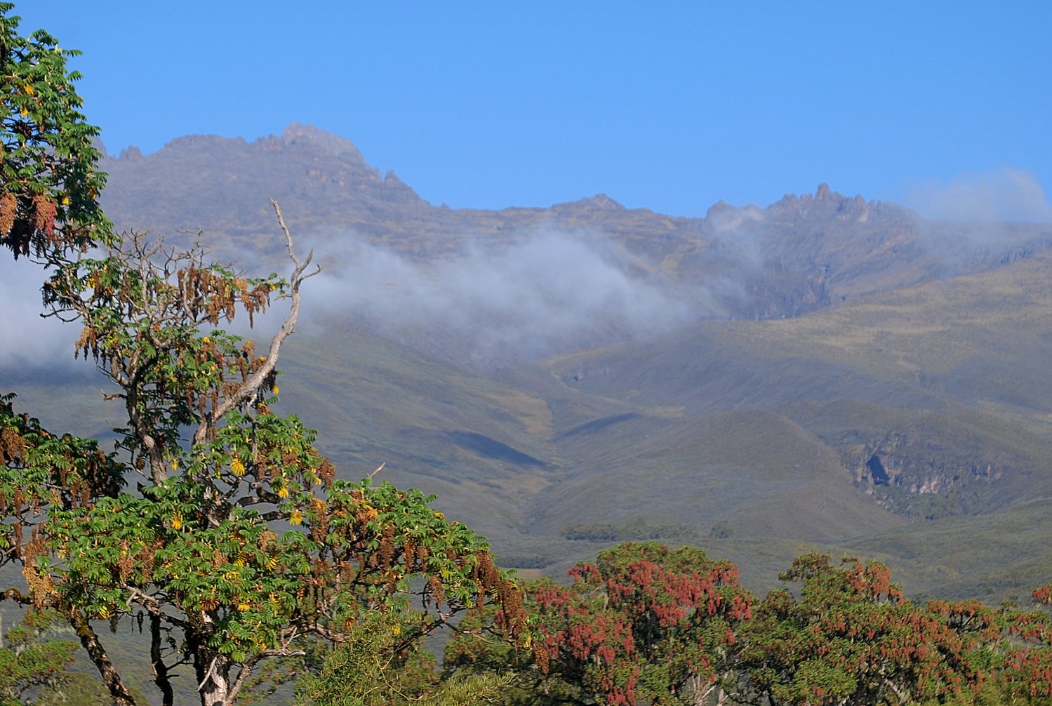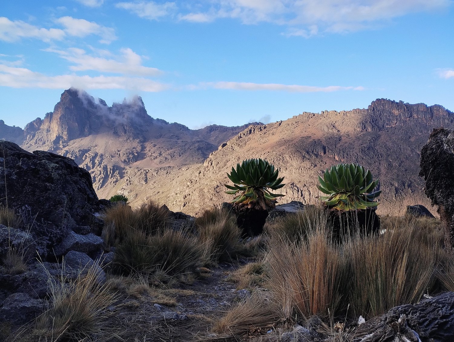Mais de 2.200 metros de altitude me separavam da visão do primeiro acampamento ao ponto culminante do Mt. Kenya (à esquerda na foto, em último plano).