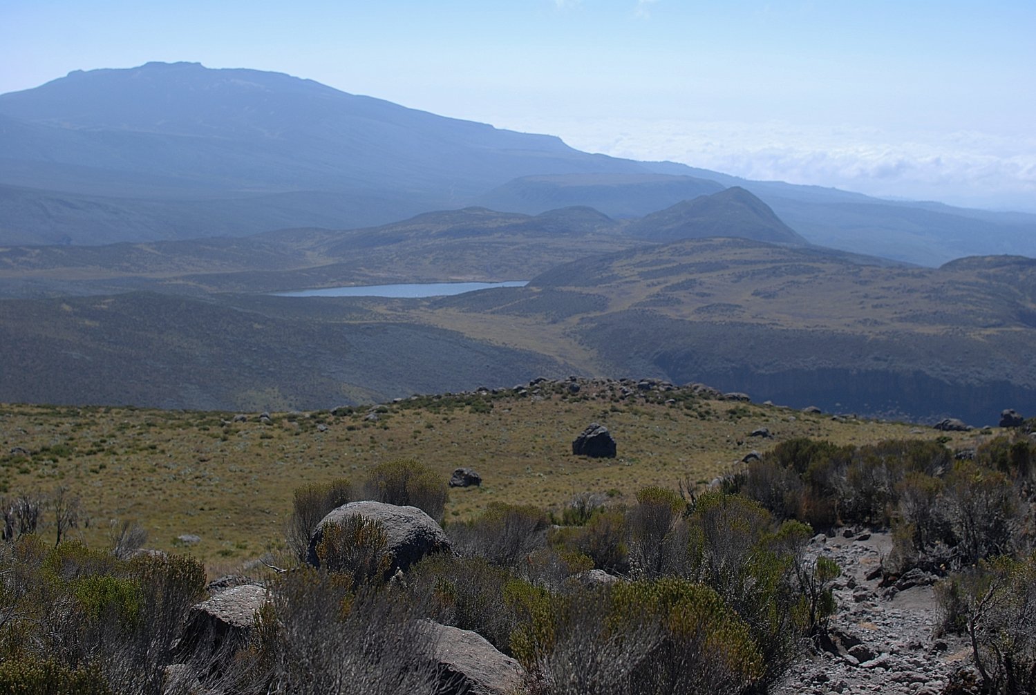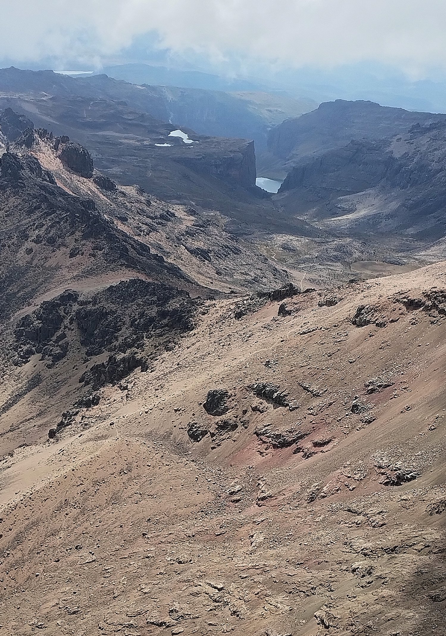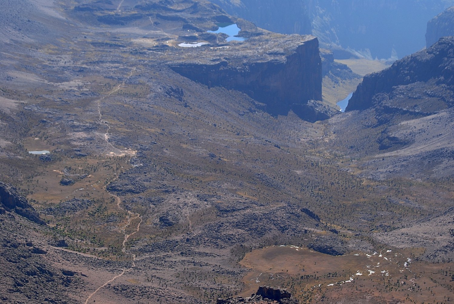 Agora vista do cume do Lenana, a rota de subida com o Templo e parte do Lago Michaelson e o Lago Hall, este último, situado nas imediações do acampamento Mintos.