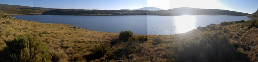 O Lago Ellis. Nota-se claramente que fiz uma montagem com quatro fotos, pois a extensão do lago impediu uma visão panorâmica em única foto. Há uma pessoa na margem mais próxima do lago, à esquerda.