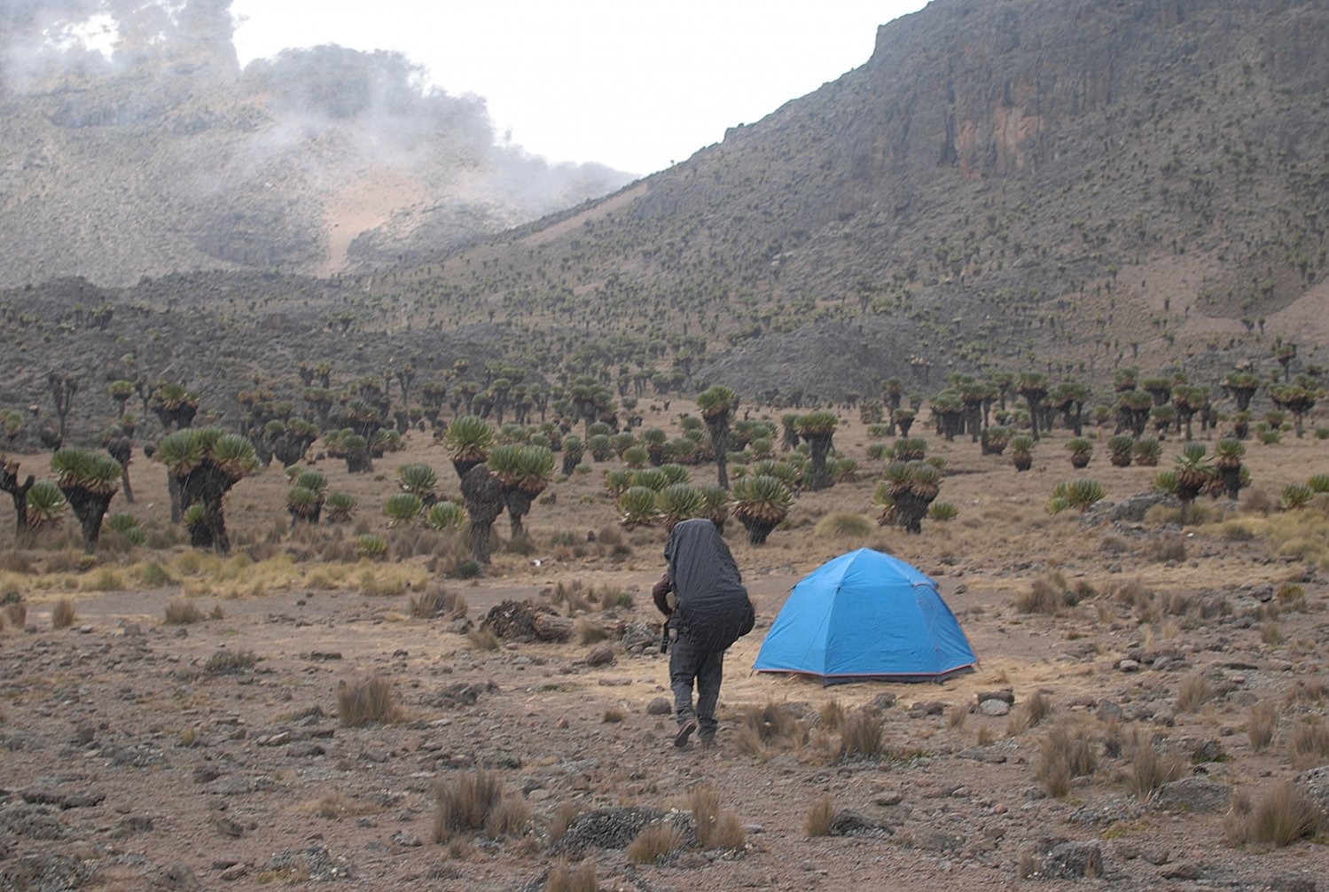 Foi difícil deixar o local, mas ele logo seria encoberto pelas nuvens. Em cerca de quarenta minutos, alcançamos o local de pernoite, mais afastado que o local normal de camping, que teria um grande grupo para subir no dia seguinte até o Lenana, o ponto mais alto a ser atingido apenas com caminhada. A opção foi ótima, pois somente nosso grupo acampou no local. Contávamos com a facilidade da água de um riacho próximo.