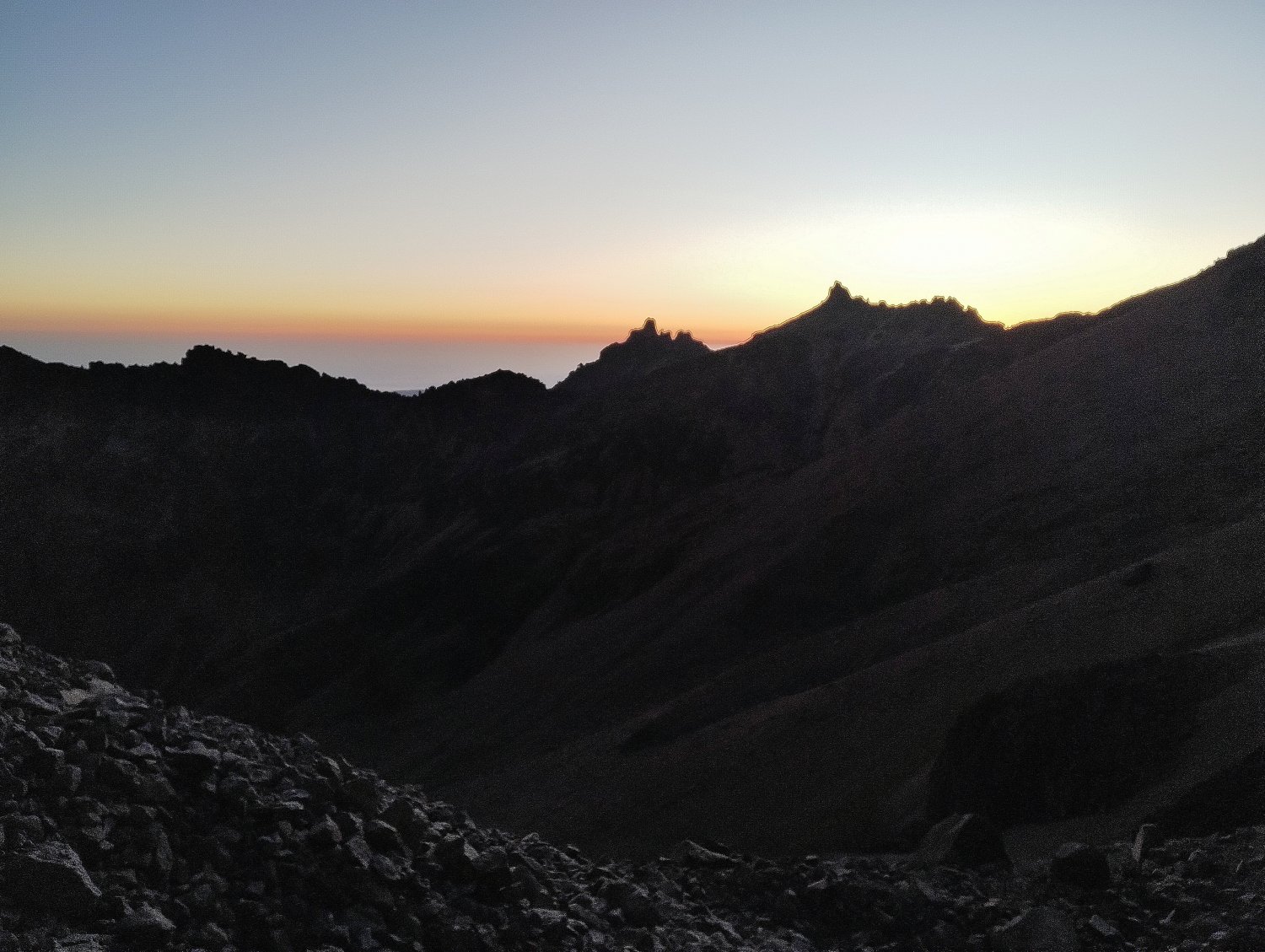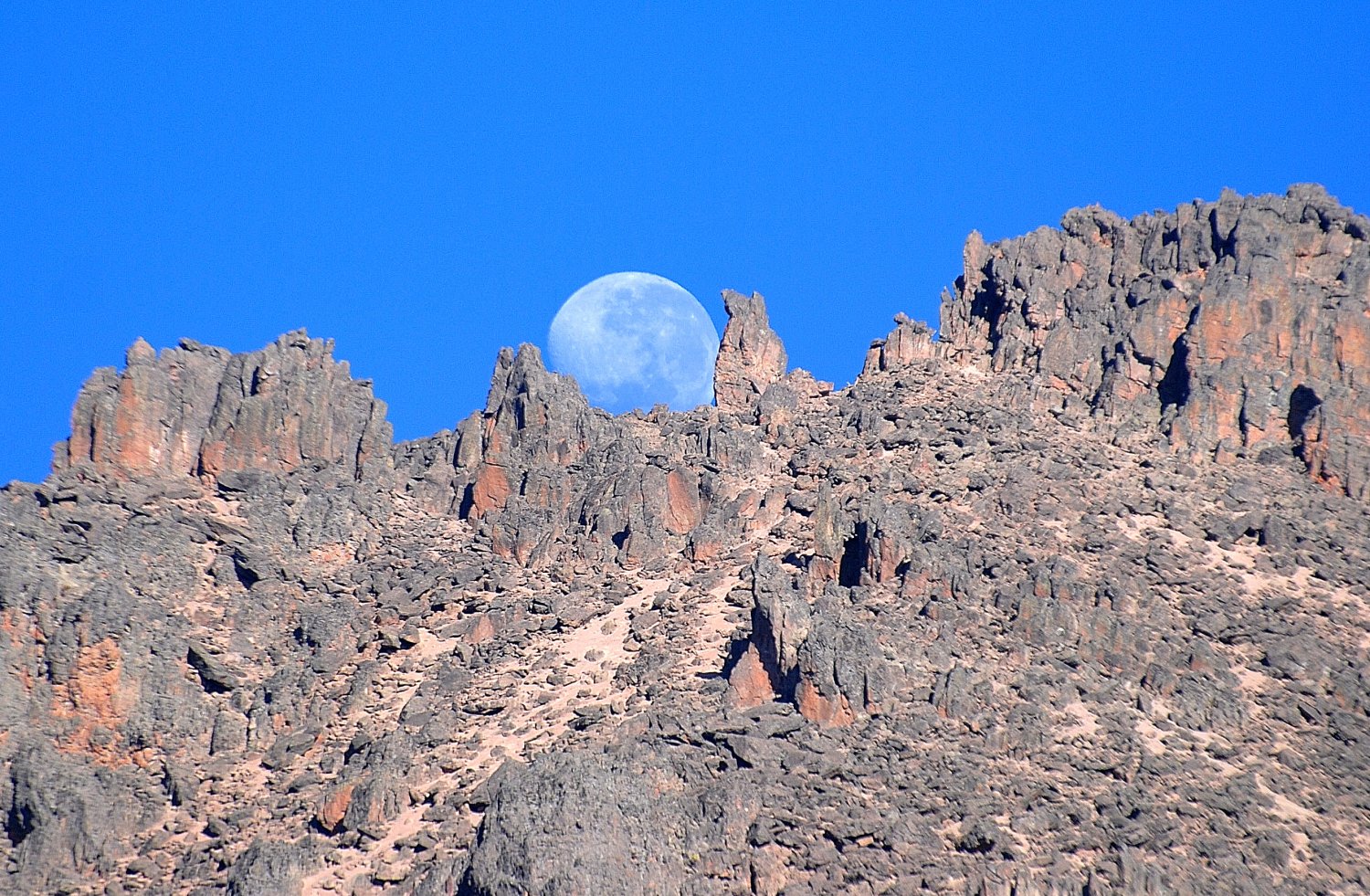 O dia seguinte, o quarto, revelou um lindo pôr da lua cheia por entre as escarpas rochosas de um pico intermediário. Era possível visualizar muitas pessoas no cume do Pico Lenana, a 4.985 metros de altitude. Deixamos os 4.200 metros e, poucos minutos depois, iniciamos a maior inclinação até então.