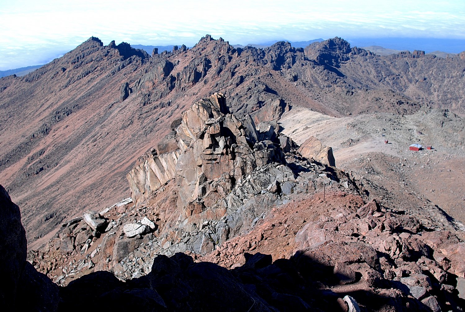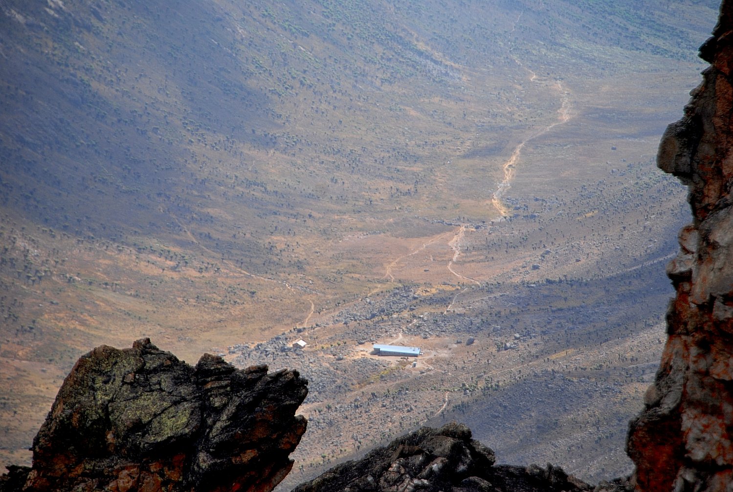 Vista do cume do Lenana. É possível ver o Abrigo Austríaco no centro e à direita na foto. Ao fundo, havia um extenso tapete de nuvens.
