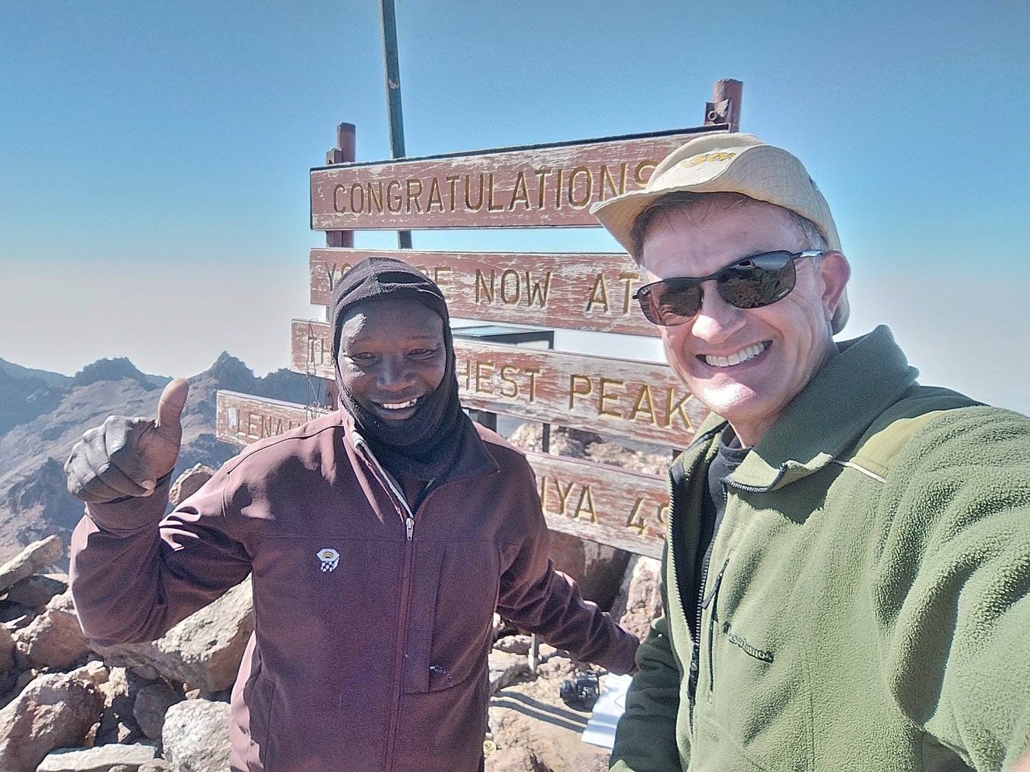 Eu e Zack no cume do Lenana (4.985m). Fomos os únicos no local. Mas encontramos um grupo descendo do cume enquanto subíamos.