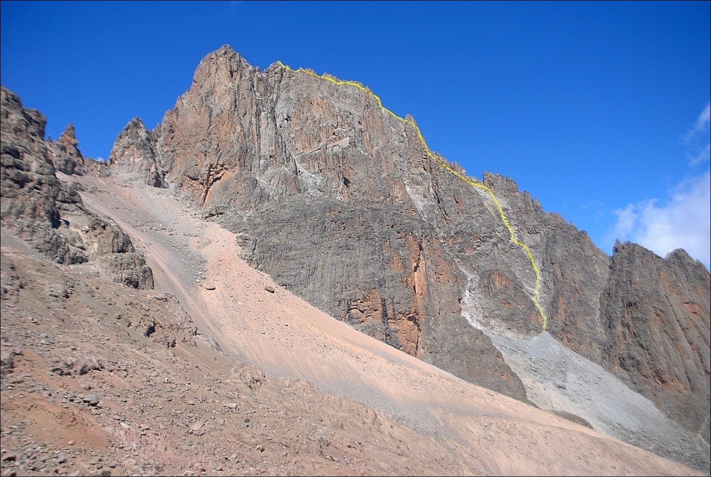 O Batian, com a linha amarela que tracei para indicar aproximadamente a rota de escalada usada.