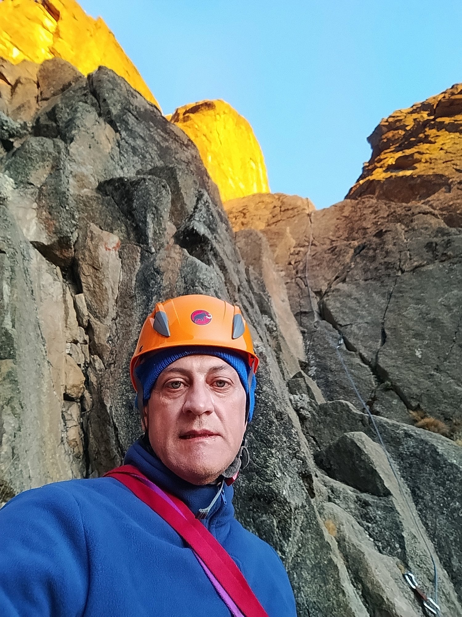 John saiu após realizarmos o duplo check de equipamentos, demonstrando uma incrível habilidade, conhecedor e frequentador assíduo da via. Pouco tempo depois, ele gritou para ser minha vez. Depois de dois movimentos frustrados ao buscar equilíbrio para o primeiro movimento, ajustei o tronco e consegui efetuar o “crux” da saída. E assim progredi rumo ao desafio desconhecido. O início foi consideravelmente vertical (eu diria uns 70°), mas com boas agarras, típicas de rochas vulcânicas, bem diferentes do granito a que estamos habituados no Brasil. Graças à baixa umidade das maiores altitudes, não havia nenhum rastro da neve e chuva do dia anterior.