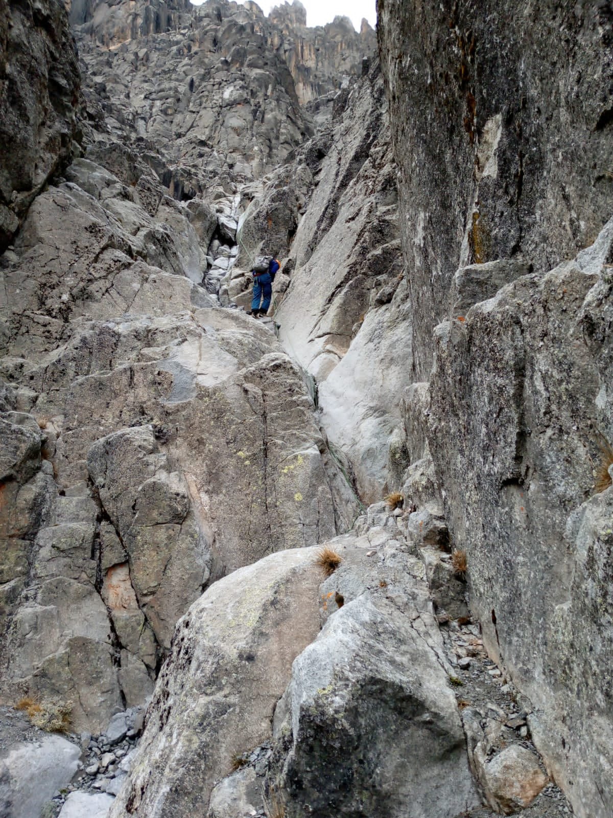 As enfiadas iniciais nos levaram ao chamado Anfiteatro, um local em que a inclinação diminui consideravelmente e onde é possível apenas caminhar. Deixei um litro de água escondido entre as rochas para aliviar o peso e ser resgatado no retorno.