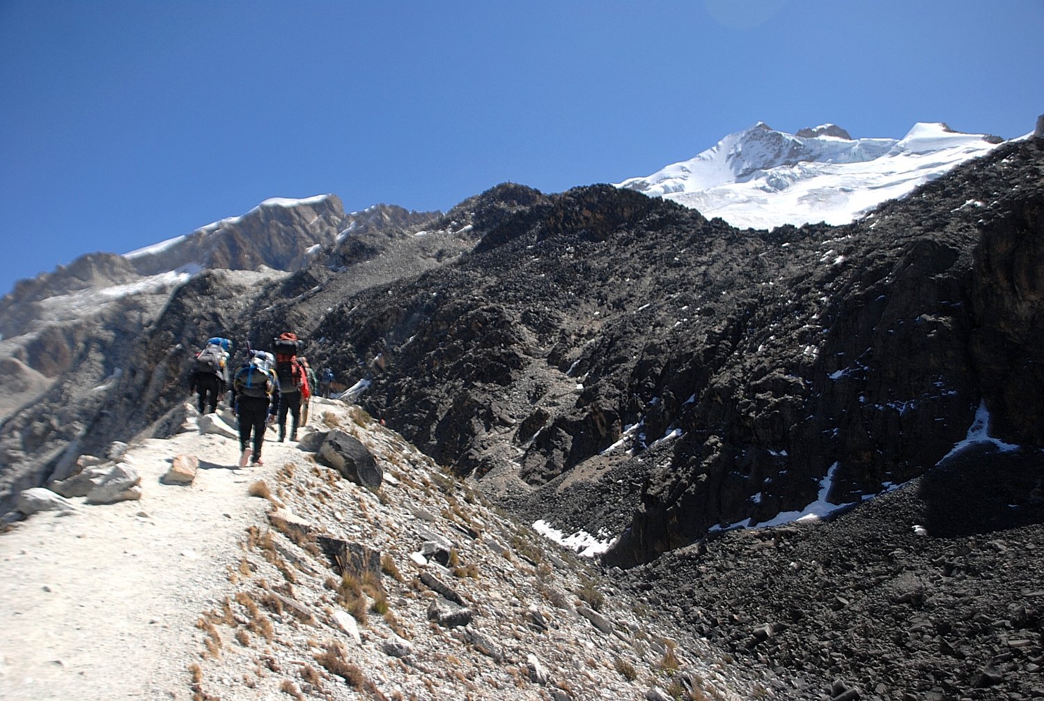 Como nenhuma outra pessoa se identificou que iria trabalhar conosco na ascensão, ficou claro ao ver Santos separando alguns equipamentos que ele seria nosso guia de fato, além do carregador da cargueira. Iniciamos a subida por volta de duas da tarde. O trecho inicial não era íngreme, mas cerca de meia-hora depois, a inclinação aumentou. Não éramos os únicos subindo e nos juntamos a dois outros grupos, composto por canadenses, franceses e israelenses. Parece ser uma prática comum os guias juntarem os grupos e adotarem atribuições específicas entre eles. Um na dianteira, outro fechando a fila. Outro eventualmente fica pra trás assistindo alguém em dificuldades. E foi o caso no nosso grupo com um turista canadense. Visivelmente, ele não estava aclimatado, pois já nos metros iniciais, começou a parar em demasia. Pouco tempo depois ele começou a gemer, literalmente. Sua agonia era perceptível.