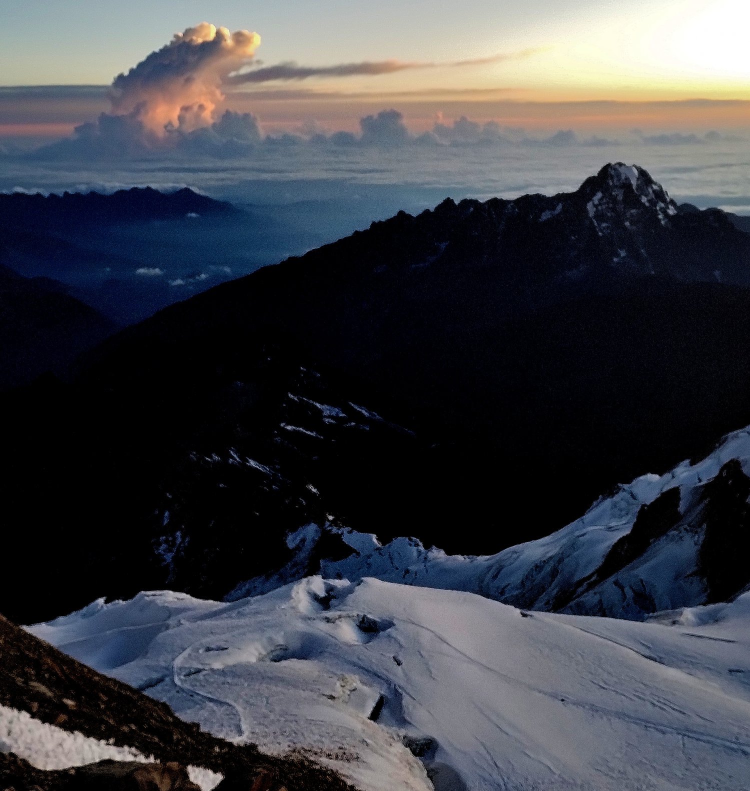 Por volta de quatro e meia da manhã, Santos nos informou que estávamos a uma altitude de 5.700 metros e que teríamos cerca de uma hora e meia até o cume. Eu estava me aproximando do meu recorde pessoal de altitude, alcançado no Kilimanjaro em 2011, ainda que um tanto fatigado, mas sem reações adversas da altitude.