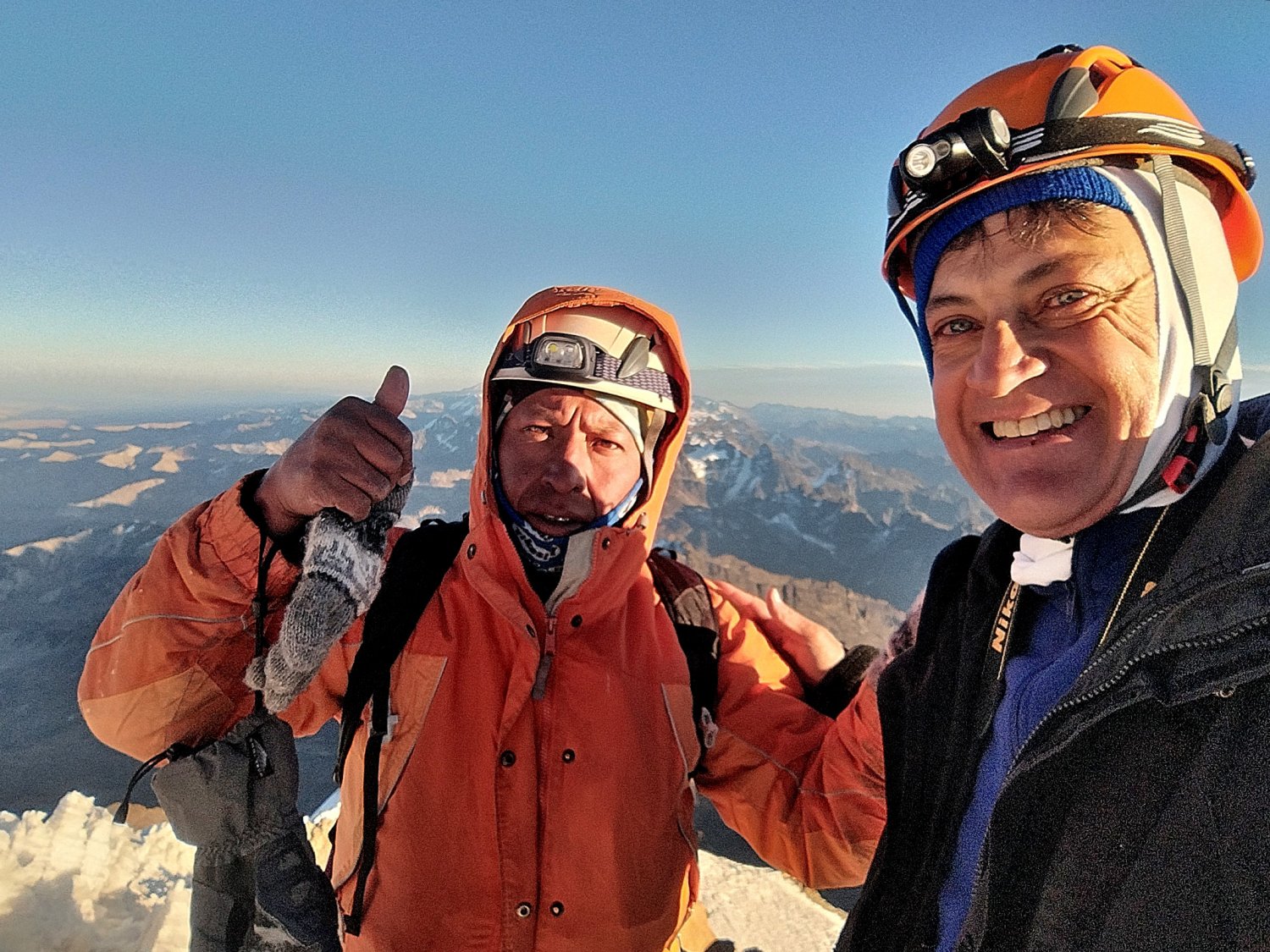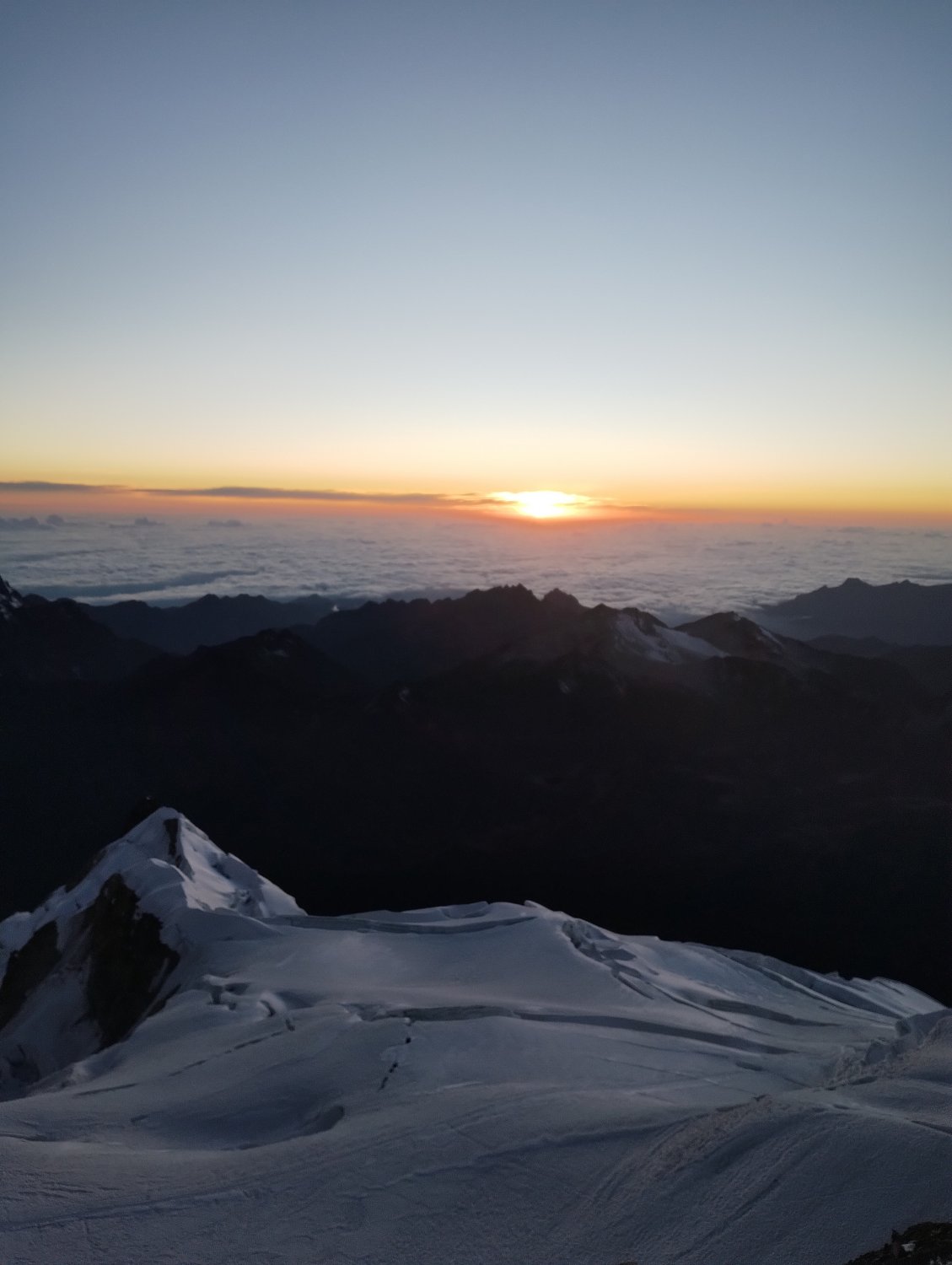 Após tantas paradas, alternâncias entre rocha e neve, rocha e gelo, o sol despontou no horizonte. Vi uma reunião de pessoas em um ponto em que não havia mais montanha acima. Perguntei a Santos se lá era o cume e ele confirmou. Abaixei a cabeça e chorei, enquanto Jeferson se mantinha silencioso. Mas eu sabia que ele estava em sua vitória pessoal após dificuldades de saúde dos últimos dias.