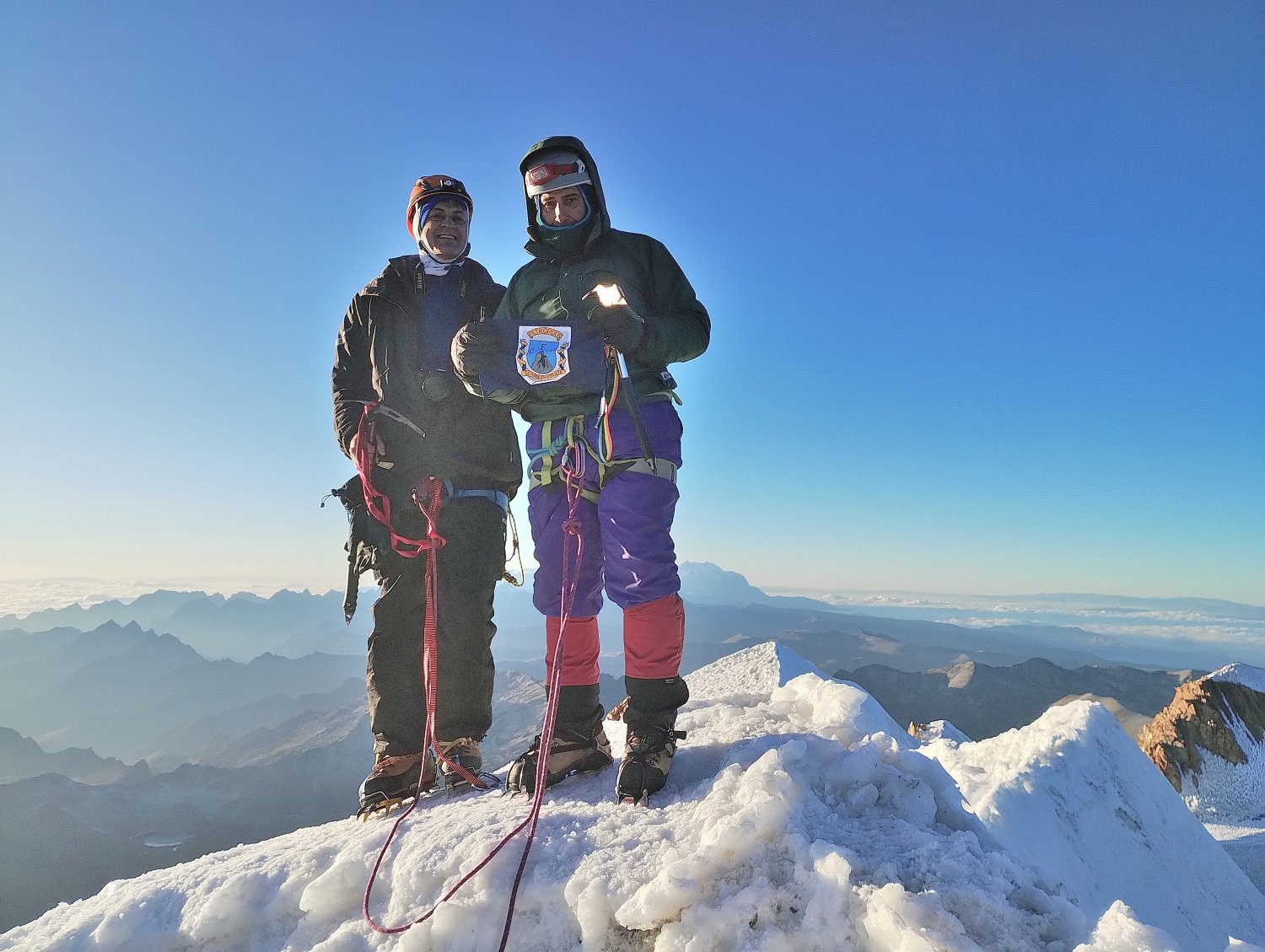 Uma última plataforma de gelo nos conduziu ao tão desejado ponto e, às 06:50, estávamos nos 6.088 metros, cume do Huayna Potosi. Meu primeiro seis mil, sensação de orgulho, de identificação com este ambiente, ainda que diante de todas as dificuldades.