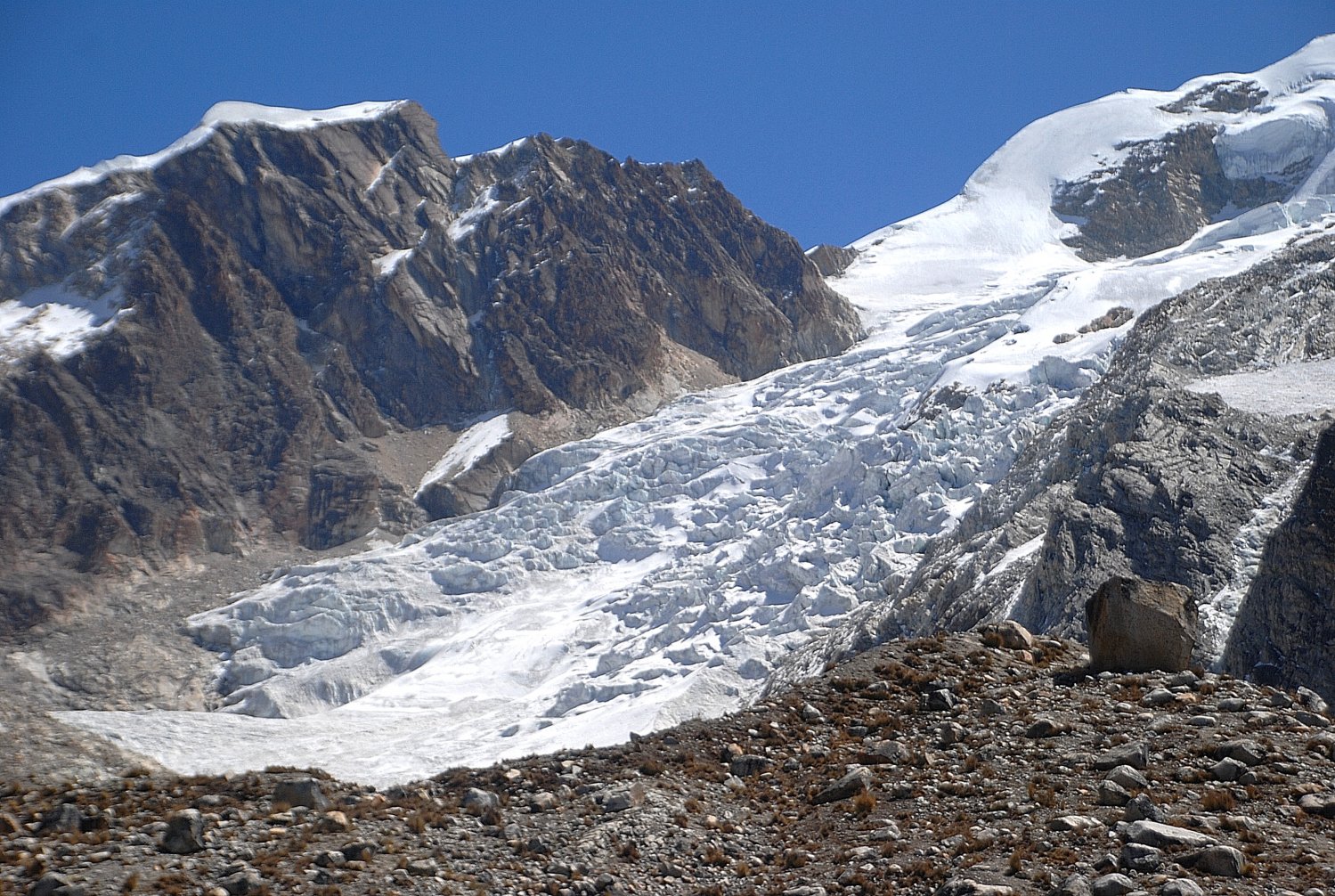 Vencida a primeira rampa, a inclinação diminuiu, mas uma rápida olhada adiante mostrou que não seria assim em breve. Contornamos uma parede de gelo com algumas cavidades monstruosas capazes de engolir um ônibus, gretas fantasmagóricas em meio a estreitas passagens na neve. O gelo foi dando lugar à neve, mas felizmente não era fofa. Eu não usava polainas. As minhas eram antigas, de velcro e não envolviam completamente minhas pernas, considerada a espessura de calças que eu usava. Também comprei uma ótima calça em La Paz que certamente saiu por menos da metade do preço de uma de qualidade inferior no Brasil.
