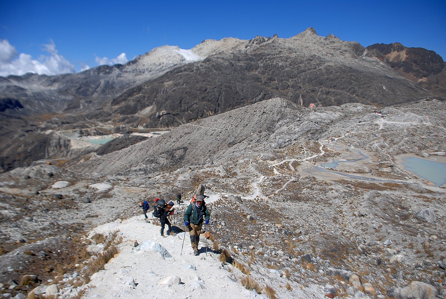 E a inclinação só foi aumentando até que chegou um trecho em zig-zag com degraus. O ritmo era lento, mas constante e sem maiores problemas fisiológicos por causa da altitude. Já era possível avistar algumas construções que indicavam os abrigos do acampamento avançado. Entretanto, apesar da aparente proximidade, ainda havia um desnível de uns duzentos metros.