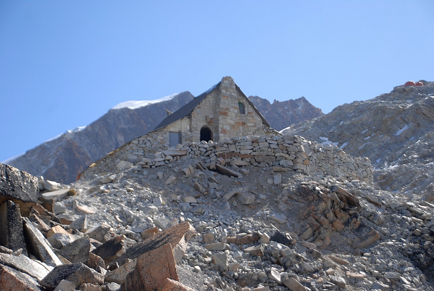 O primeiro alojamento do acampamento base avançado. Ainda subiríamos alguns metros mais. Observar no canto superior direito da foto mais alguns alojamentos.