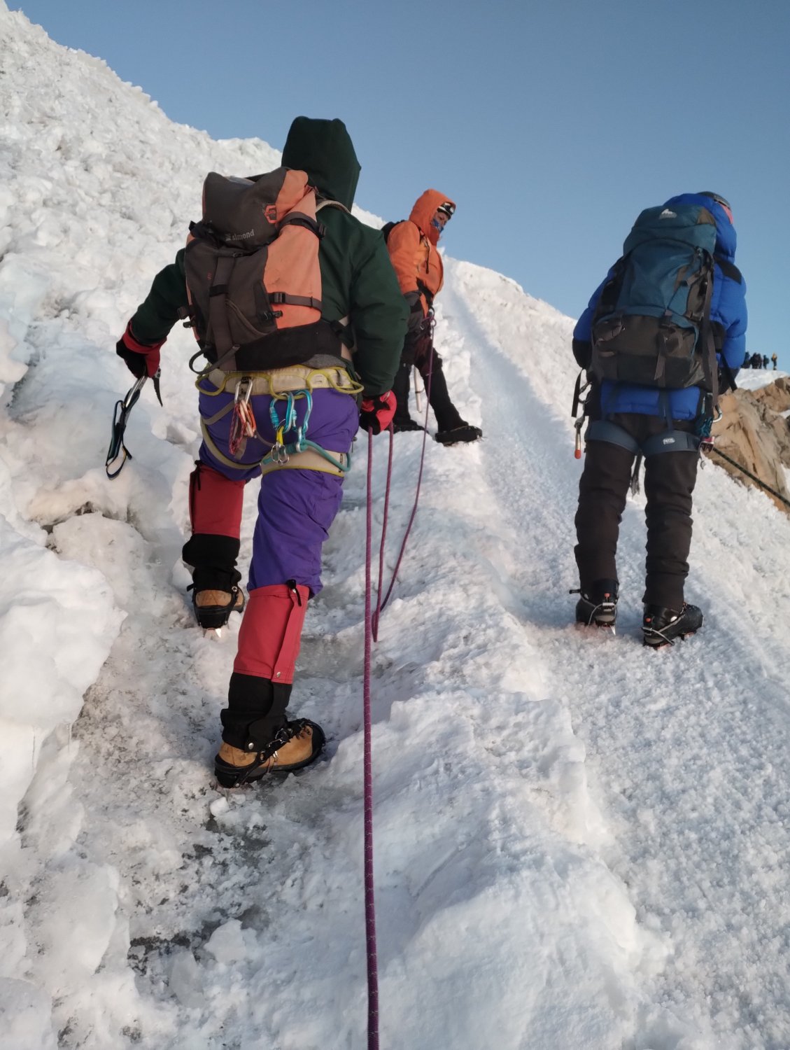 Começamos em uma rampa de gelo com uma inclinação de cerca de 40°. Depois que se ajusta os movimentos do corpo e se adquire ritmo constante, não há muito mistério. Outra arte é saber ajustar a quantidade de roupa que se usa à troca térmica com o ambiente, que está diretamente condicionada ao ritmo de uma ascensão. Na dúvida por mais agasalhos, eu havia comprado em uma feira de rua em La Paz um agasalho de fleece pelo equivalente a R$52,00. E eu suava em bicas agora!!!
