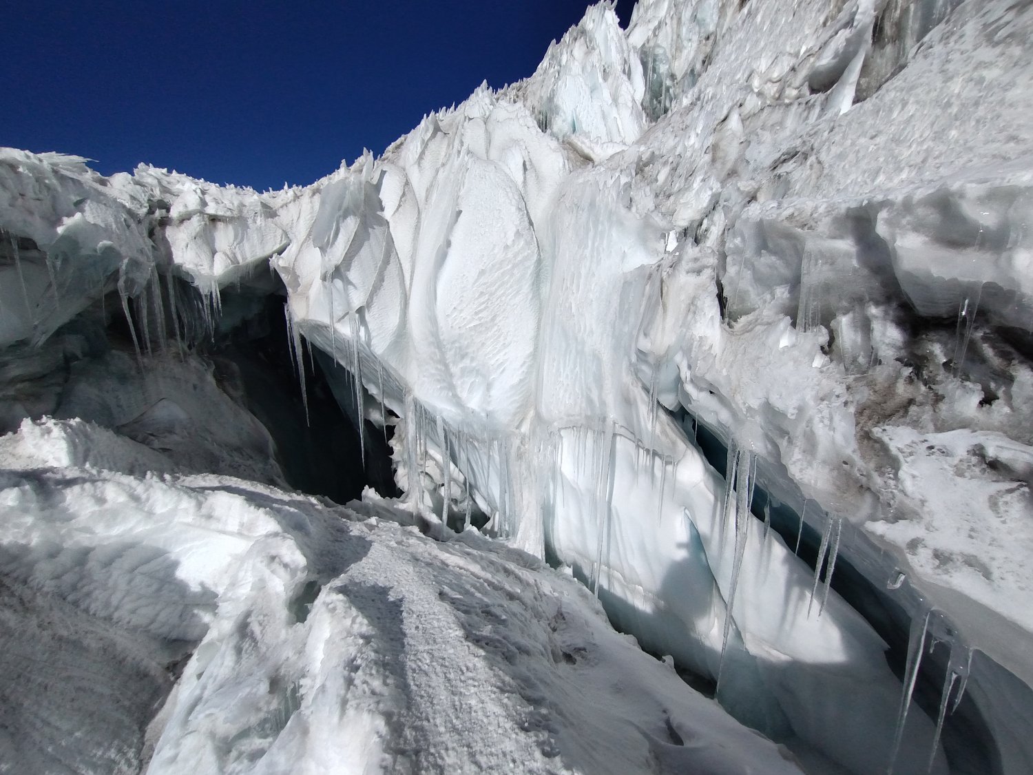 A descida foi rápida e revelou detalhes de gretas e bocas de gelo por onde passamos na escuridão. Despencamos 1.200 metros em quatro horas. Antes, porém, fazendo uma pausa no abrigo avançado para reaver os pertences que não levamos para o cume. Preparamos a cargueira e verificamos com Santos se ele podia descer com ela por mais uma grana. Ele não titubeou.