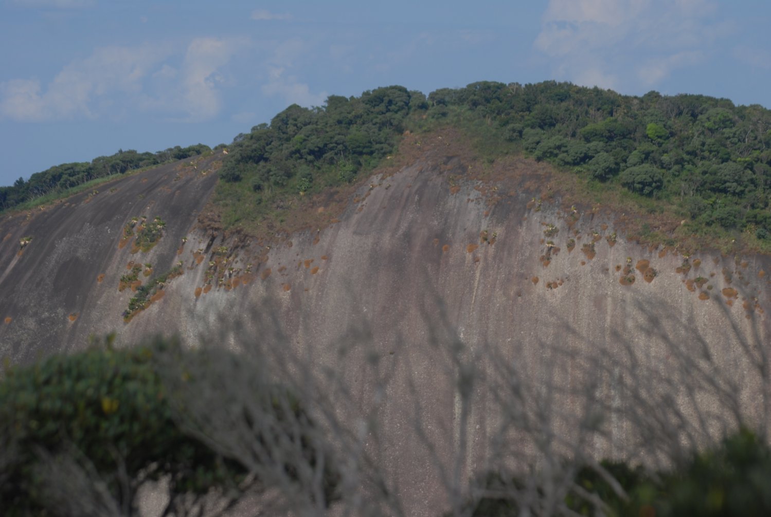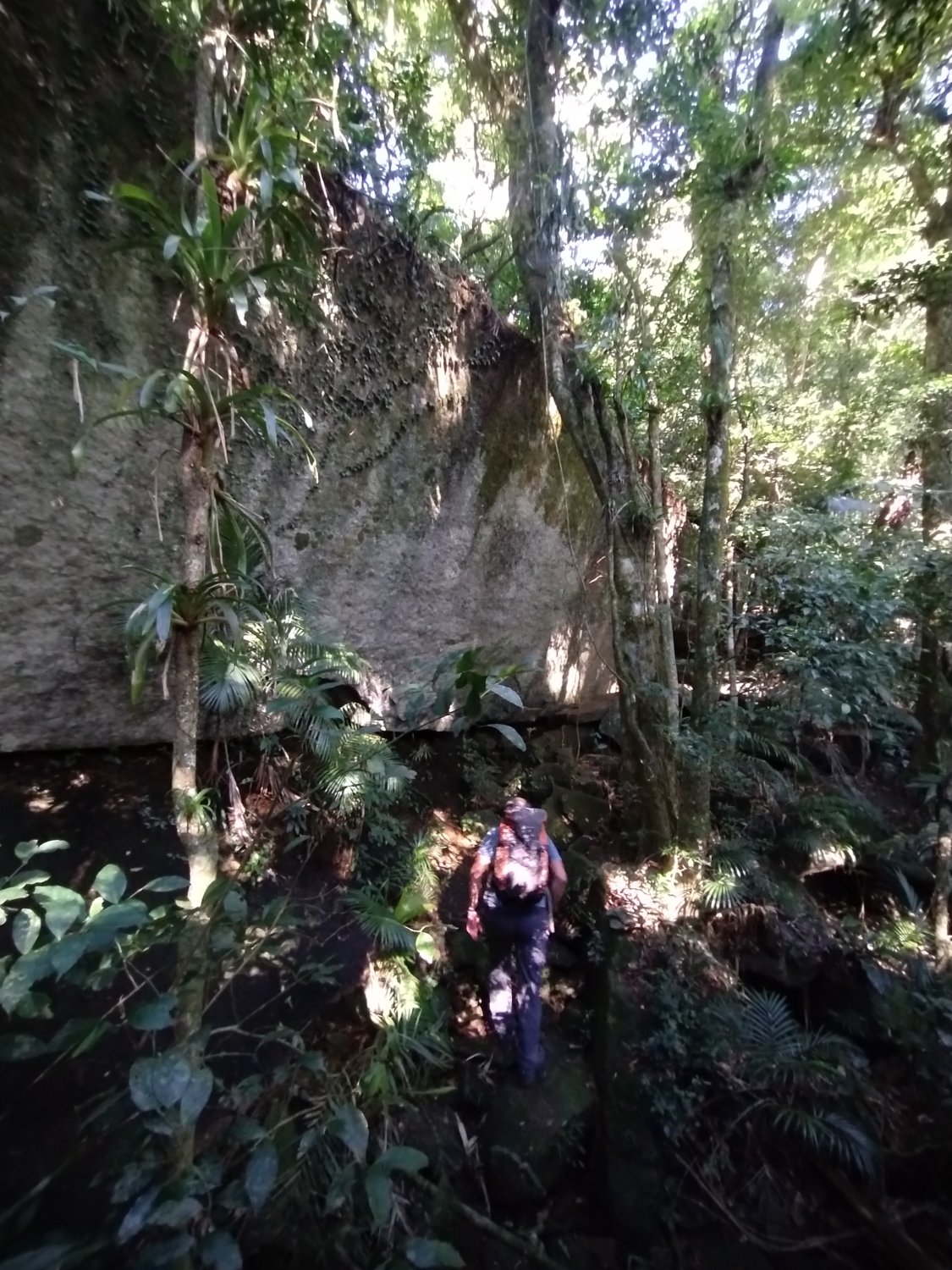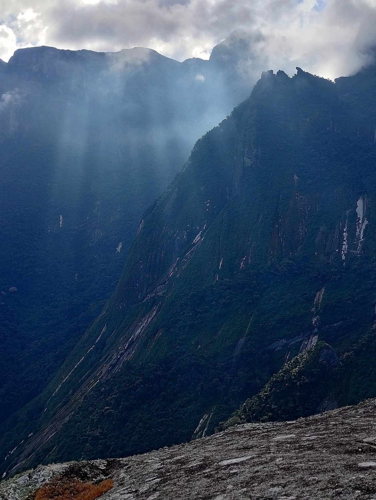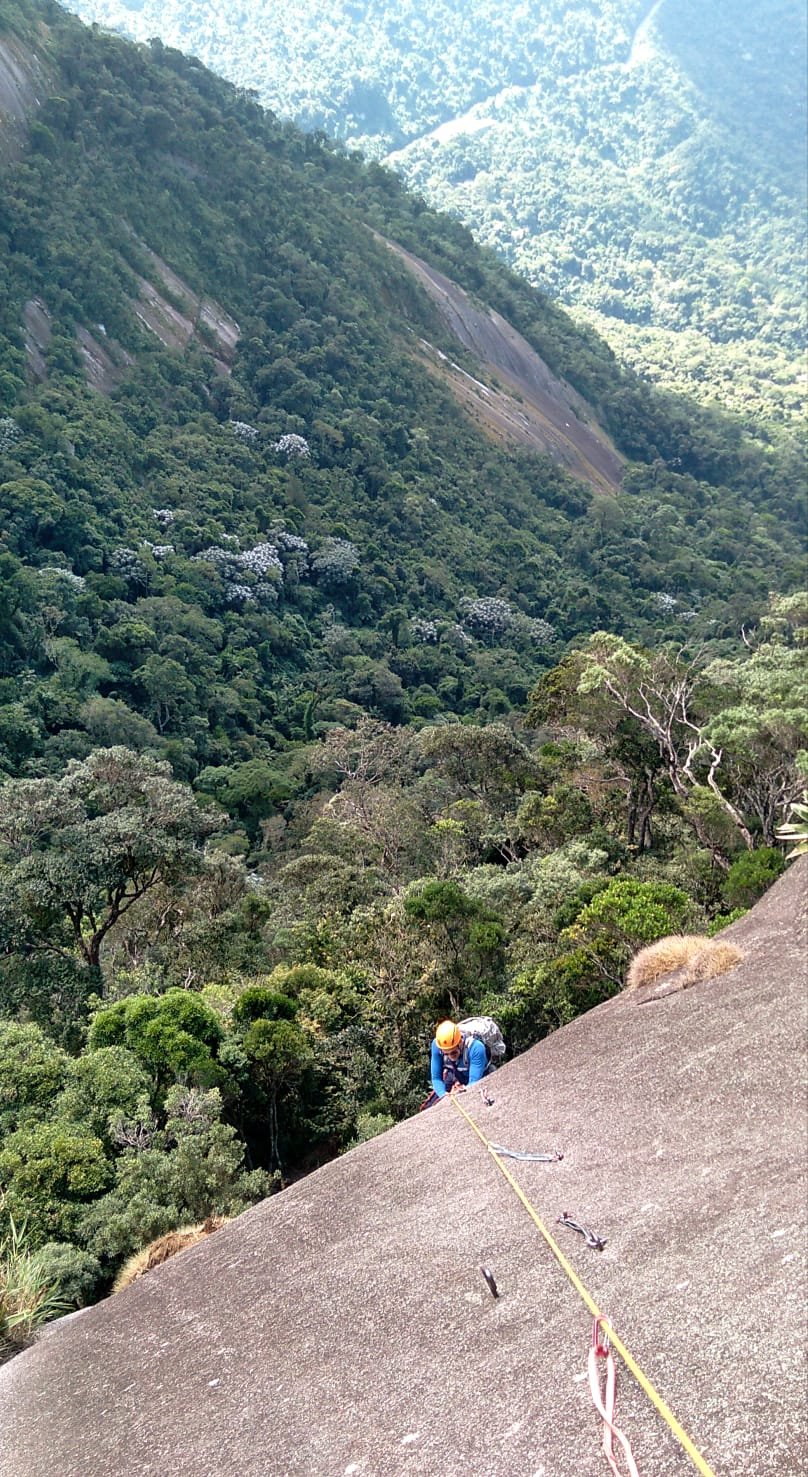 Estávamos finalizando o último trecho de artificial quando a primeira cordada, que descia, passou pela gente. Terminamos o último trecho, totalizando acredito uns duzentos metros de ascensão desde a base da escalada. Faltava apenas um trecho íngreme, mas que permitia caminhar, apesar de escorregadio. A luz do sol não era frequente no local, muito oculto por rochas e foram estas que permitiram um movimento de oposição de forças com os braços para evitarem-se os escorregões. Ao fim deste trecho, observamos mais uma cordada que havia terminado o rapel por outro trecho. Todos já haviam descido e o cume estaria disponível apenas para a gente. Jeferson falou que estávamos quase lá e agora uma simples caminhada nos separava do objetivo final. Meu xará, iniciante no mundo da escalada, se encantava com o primeiro cume necessariamente envolvendo escalada.