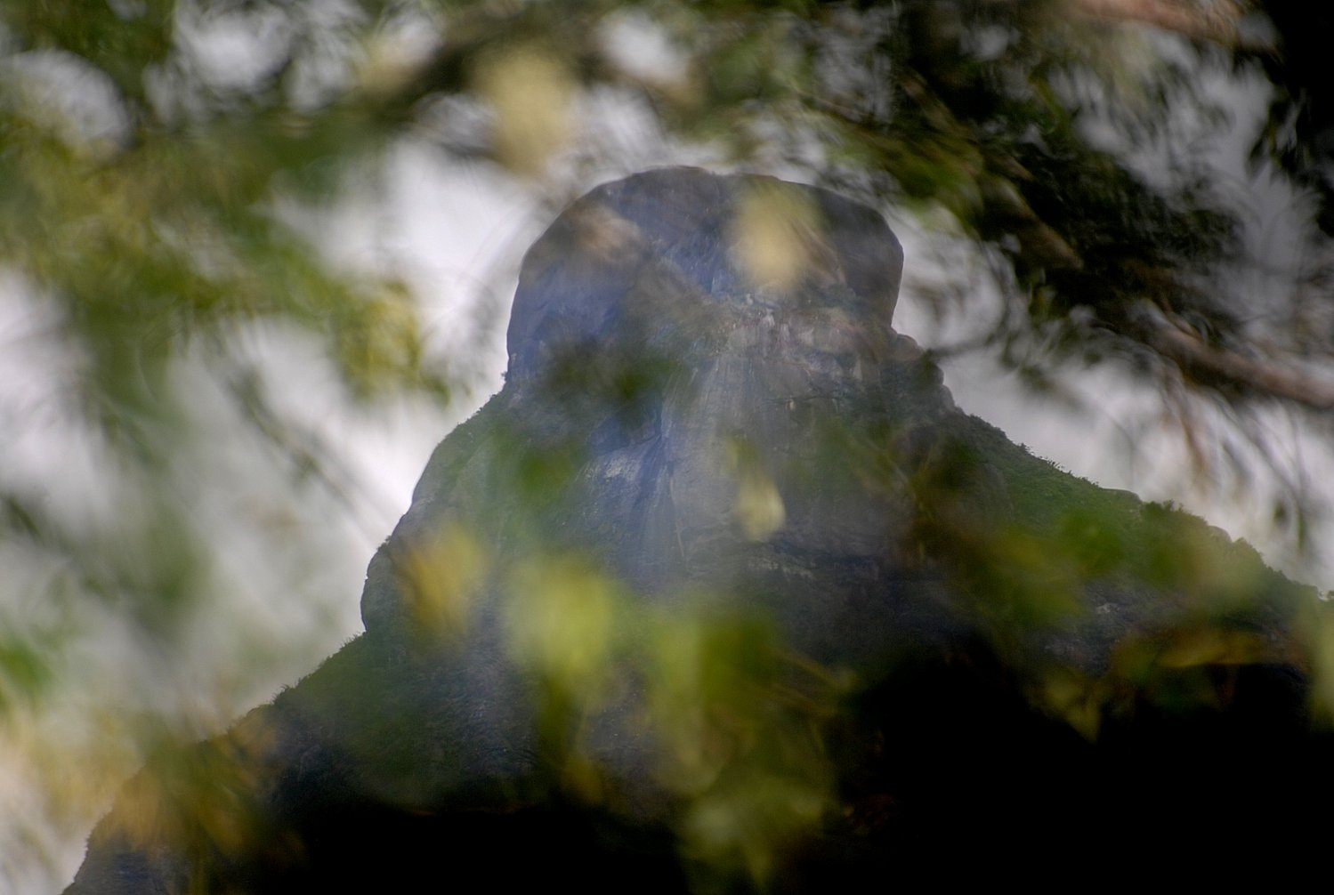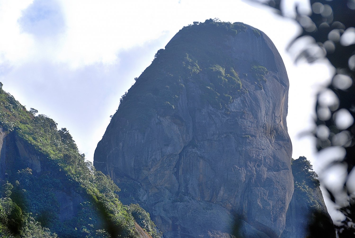 Zoom no Dedo de Deus, visto da base da escalada. A porção mais baixa e à direita é o Polegar.
