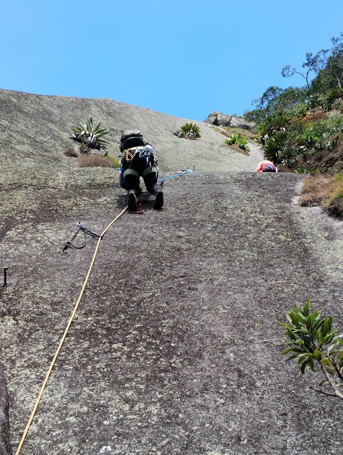 Em função deste congestionamento, nos preparamos calmamente. Lanchamos e nos equipamos para os lances. A saída já seria em artificial e assim seria durante toda a escalada. O artificial é o recurso de escalada em que são usados estribos, fitas e, se você é pragmático, até mesmo os grampos para apoios de mãos e pés em função da ausência de agarras e alta inclinação da via. O granito parece que foi lixado. Apesar de ser curta em extensão, vias deste tipo são comparativamente mais demoradas às vias tradicionais.