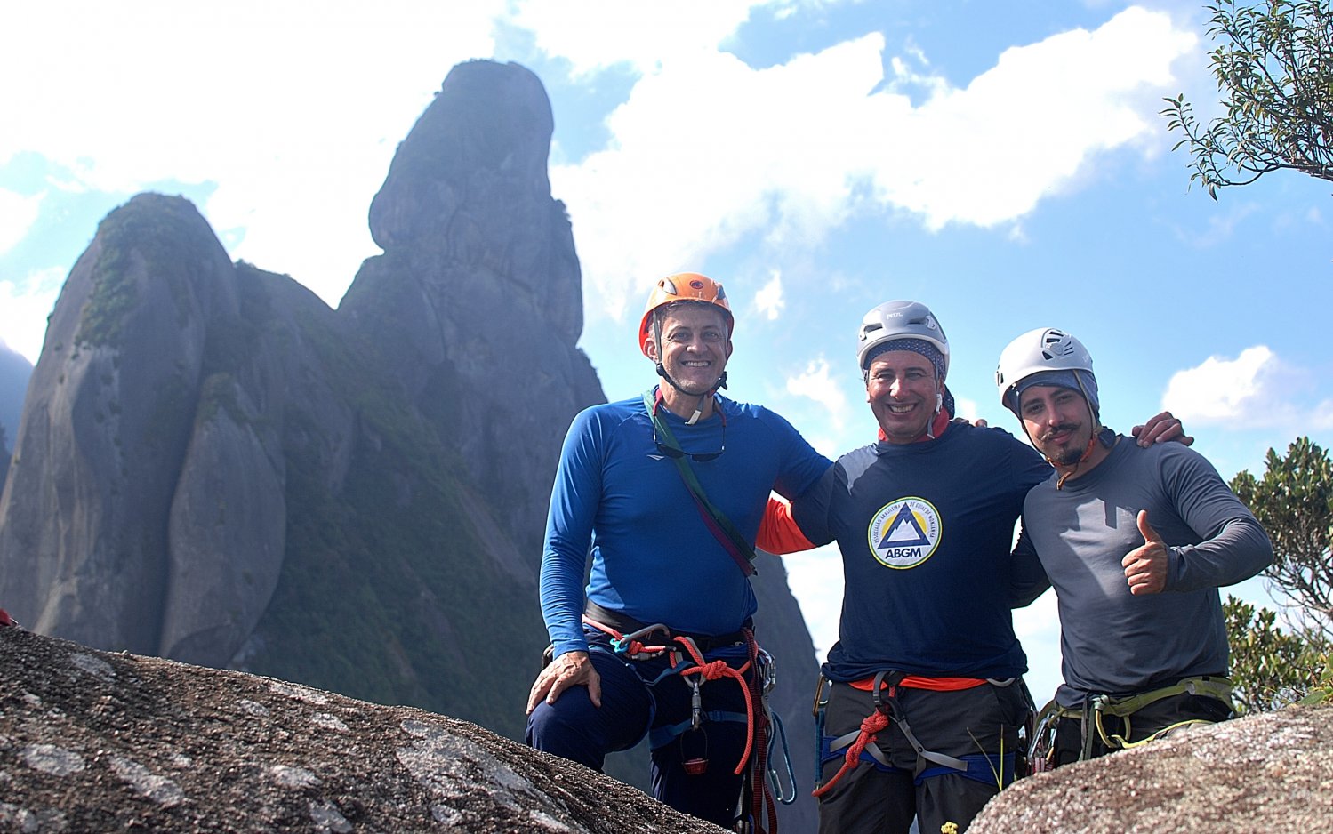 O trio no cume. Da esquerda para a direita, eu, Jeferson Costa (guia e instrutor ABGM) e Marcelo Borges.