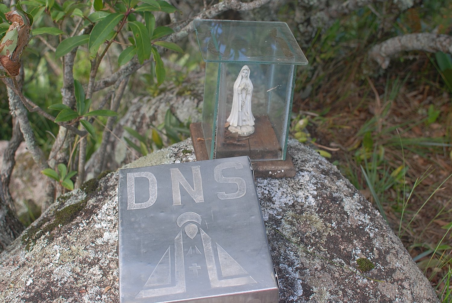 A imagem de Nossa Senhora de Fátima com a urna metálica contendo o livro de cume.
