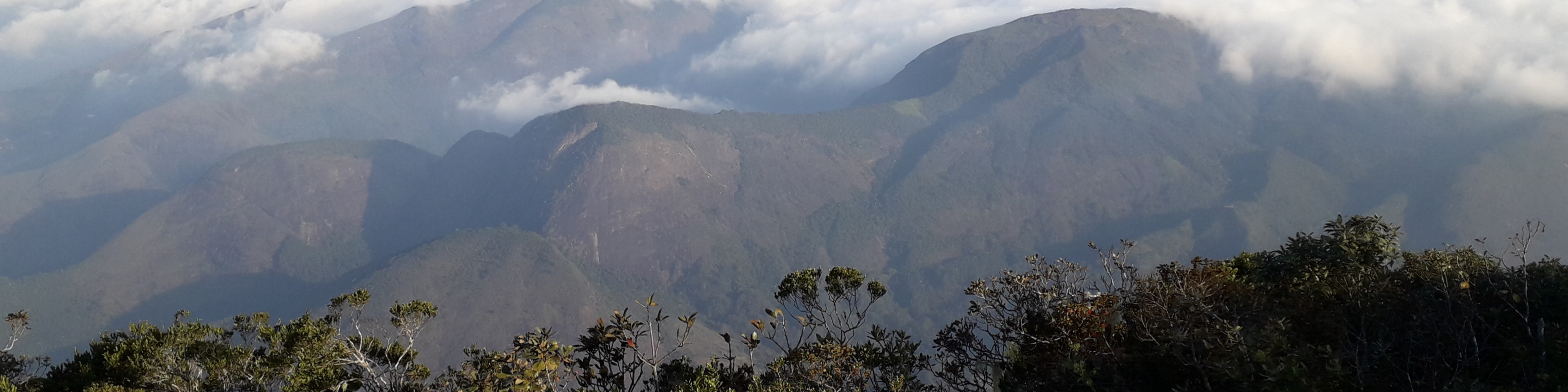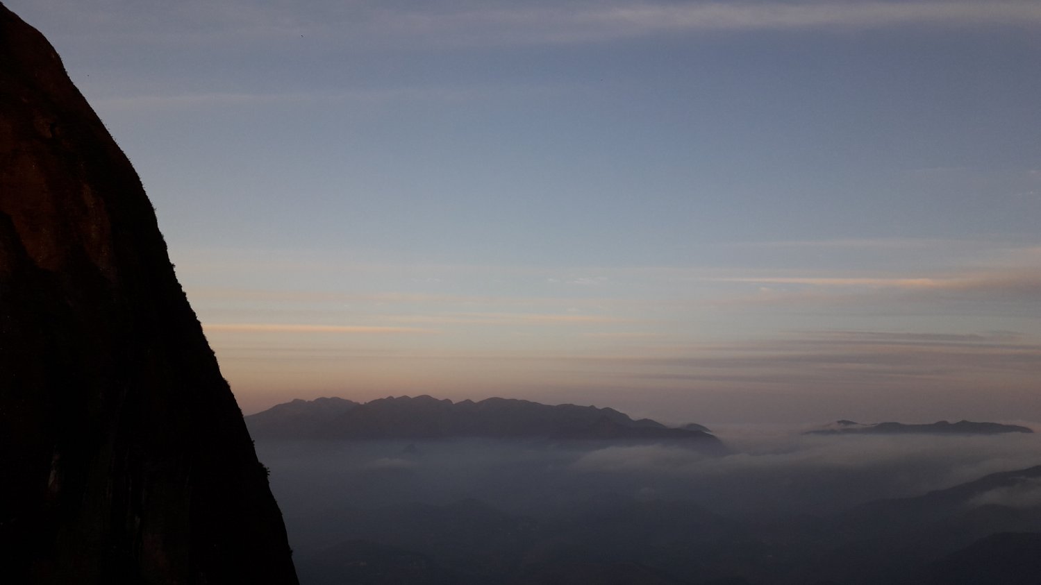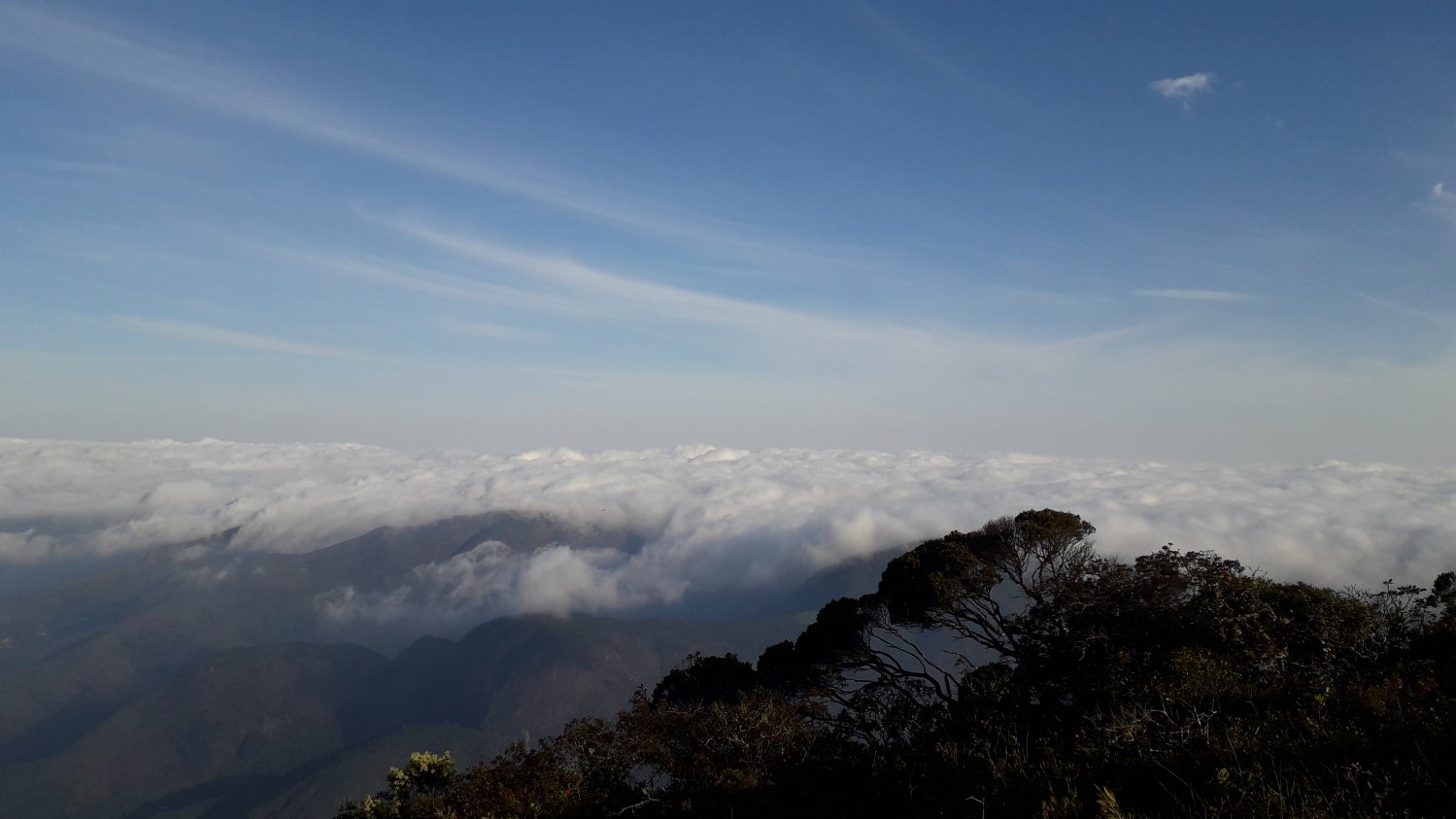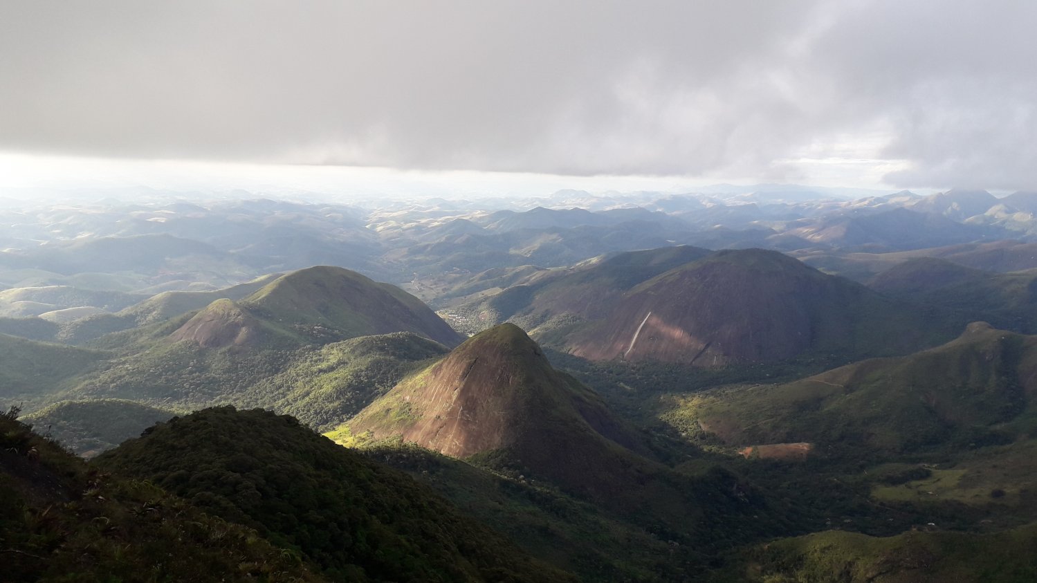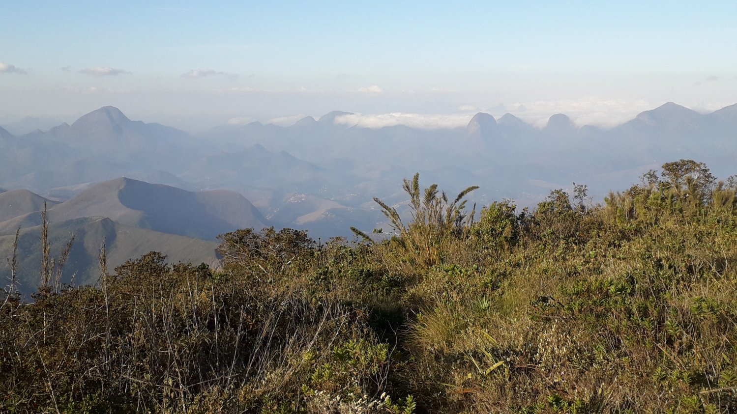 Visão do cume voltada para leste. À esquerda, no sentido do afastamento, são vistas a Pedra de Itaipava e o Taquaril. A partir das nuvens no centro, indo para a direita, são vistos o Cantagalo e, no canto direito, o Pilatos.