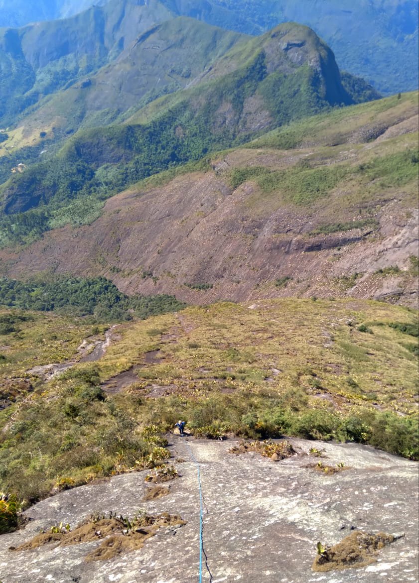O alcance visual se ampliava e a paisagem se tornava cada vez mais bela à medida que completávamos mais um esticão e eu mentalizava um a menos na contagem. Até que finalizamos o penúltimo, que termina em uma confortável plataforma horizontal. Ainda havia um lance de quinto grau na pequena e lisa parede a nossa frente.
