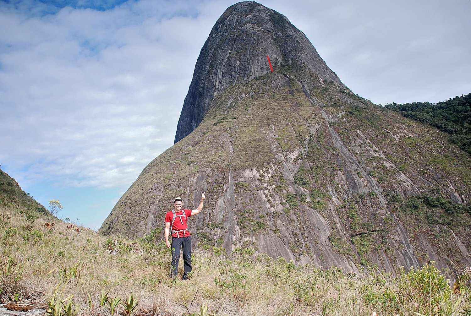 E ali eu estava, estudando as passadas. Na verdade, para mim, ali era o crux. Por que, meu Deus, tinha que ser justamente na última enfiada? Já não me sentia mais o homem-aranha! Entrei no lance, cuja inclinação devia ter algo em torno de 80°. Mas algo estava errado, os pés estavam trocados. Ainda tentei impulsionar o corpo para cima na aderência, mas escorreguei e voltei à base. Na próxima tentativa, entrei com os pés trocados, segurei com os dedos da mão direita em uma mini-agarra, mas onde agarrar com a esquerda? Então olhei para uma cavidade. Era ali, o tudo ou nada. A gravidade conspirava novamente para me puxar para baixo. Então, dei mais um passo e fiz esforço com a perna direita, confiando cegamente na aderência das sapatilhas. Bendito atrito! Lentamente, fui subindo até conseguir pôr a palma da mão esquerda onde em queria ao mesmo tempo em que elevei o pé esquerdo pisando lateralmente para aumentar a área de contato, o que melhorou meu equilíbrio, aumentou minha tração com a mão direita e aliviei a carga sobre os pés. Eu havia vencido a gravidade e me emocionei por isso. Não só pelo lance, mas por toda a via que exigiu sete horas e quinze minutos de ascensão, pela primeira tentativa abortada, pela paisagem que pude olhar ao meu redor, pelo sabor do objetivo cumprido, pela comunhão com o ambiente de pureza.
