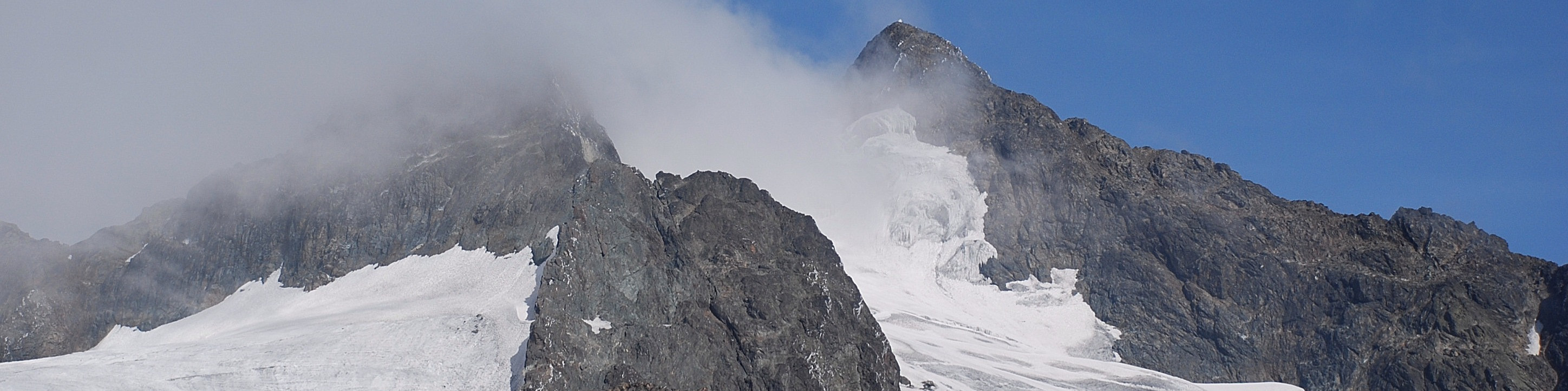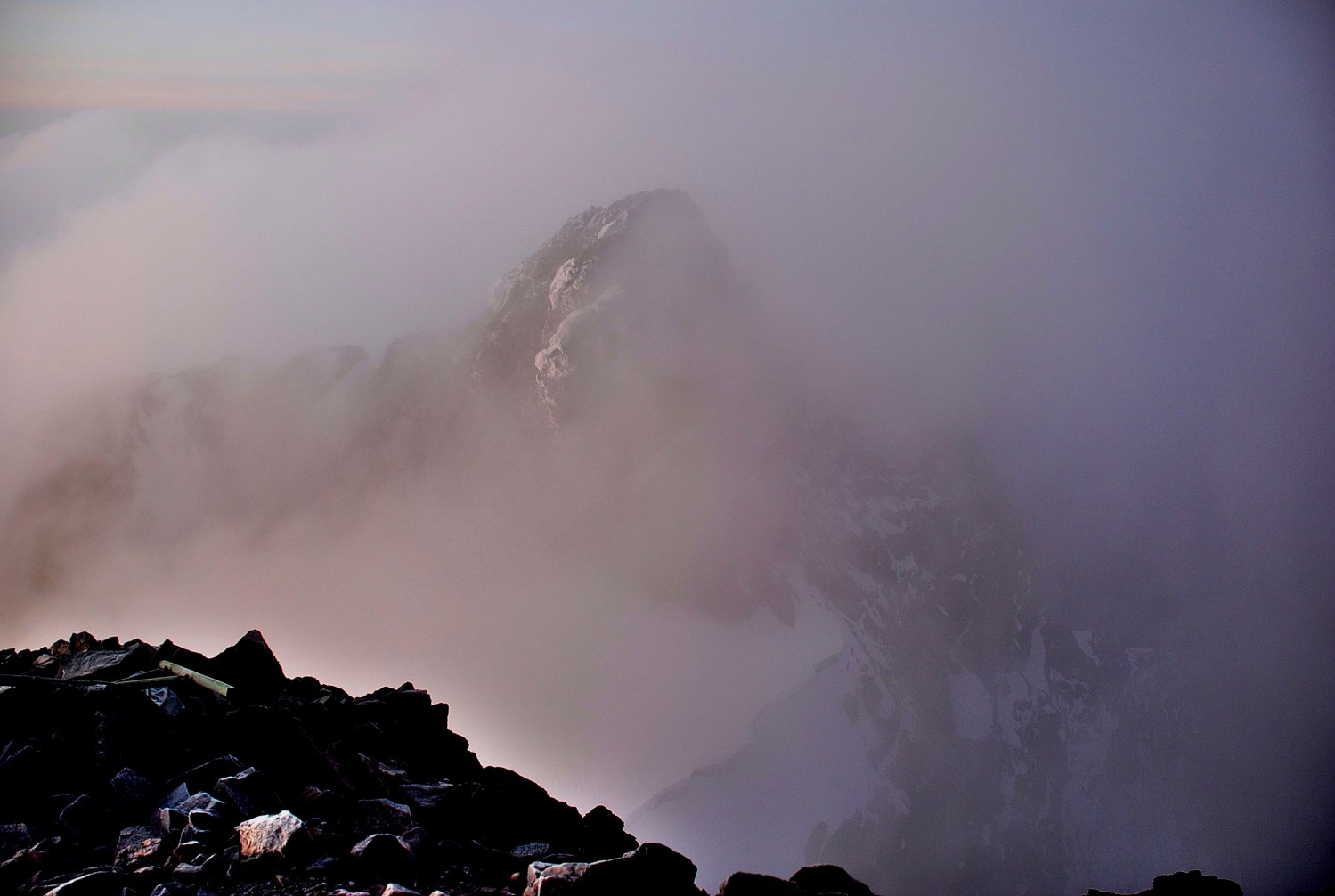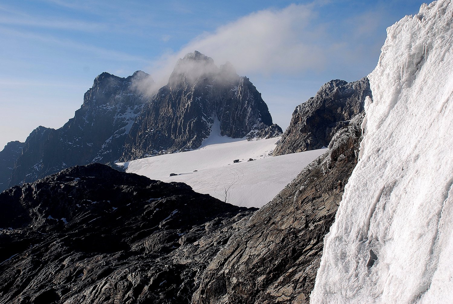 A visão do cume. Uma bruma envolvia o Pico Alexandra, separado do Pico Margherita pelo glaciar de mesmo nome deste último, que se projetava por um vale à esquerda da foto. À direita havia um precipício que se projetava para a República Democrática do Congo.