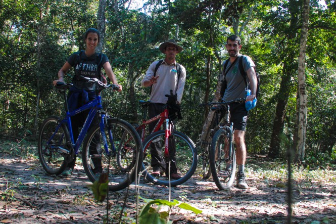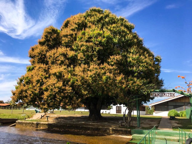 Após o café da manhã fomos até a reserva Acurizal, 1 hora de barco rio acima, para conhecer uma piscina natural. Fizemos a trilha de 8km de bike, com trecho final à pé em uma mata mais antiga com grandes árvores, muitos pássaros cantando e um show à parte da tapuíra, ou “cacique”, uma ave que imita o canto de outras com as quais convive, foi um momento especial.