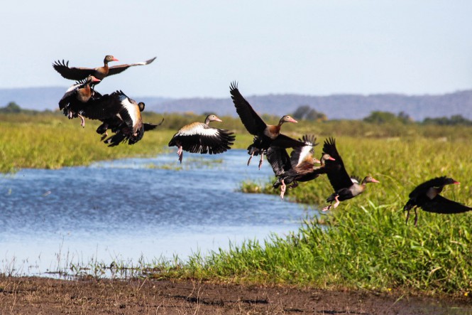 Aqui no Pantanal acordamos às 5:30 para ver o dia clarear e o sol nascer. Um espetáculo! Às 6h00 vem os mosquitos. Logo os pássaros começam um alvoroço e fazem um show de cantoria: caturrica (da família da maritaca / papagaio), jaó, joão colobó, gralha azul, araras e muitos outros.