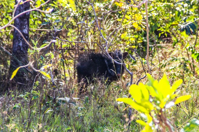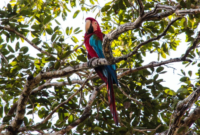 Às 7h45 começamos uma trilha de 16km que fez nos sentir em um verdadeiro safári, com o pequeno detalhe de estarmos a pé. Cruzamos vales, morros, planícies alagadas com água até os joelhos e vimos quase de tudo: tuiuiú, pica-pau, araras vermelhas posando pra foto, gado, incontáveis tipos de pássaros e um cateto, um grande porco do mato, que para nossa sorte estava sozinho e não se assustou conosco. Quando estão em bando, podem ser bem agressivos, portanto cada um já tinha mirado uma árvore para trepar caso o bichão se irritasse com a nossa presença, mas ele estava tranquilão.