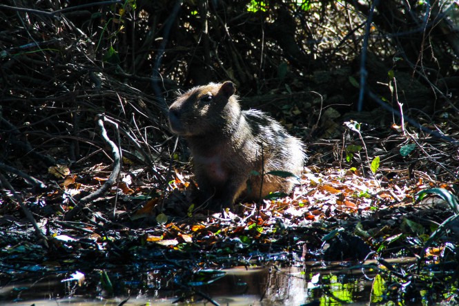 Na volta de barco à pousada, tentamos localizar uma onça que estava nas redondezas. A expectativa cresceu quando nosso guia Adriano chamou a onça imitando seu esturro e ela respondeu ao longe. No fim, porém, ela resolveu não se mostrar para nós e nos contentamos com uma família de capivaras à beira do rio.