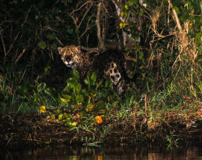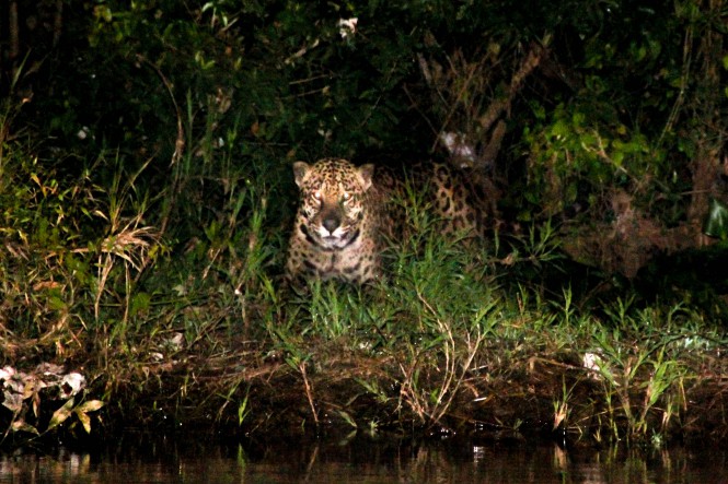 Mas o melhor do dia ainda estava por vir. Sugerimos que fizéssemos um passeio noturno para focagem de animais (o que não existe por lá), pois a lua cheia permitia boa visibilidade. Com auxílio de boas lanternas pra iluminar as margens, identificávamos os animais pelo brilho dos olhos ao serem iluminados. Quando eu menos esperava, a maior surpresa: foco minha lanterna em um barranco e vejo uma enorme cabeça dourada com pintas pretas. Sim, era ela, a onça pintada!